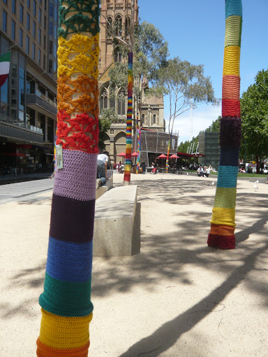 日本でどうなっているか分からないのですが、ここメルボルンで街の木、自転車、ベンチなどを鍵網やニットでデコレートするのがこの数年結構流行っています。「ヤーンボミング」(糸でジャック!みたいな意味)と言いますが、ところどころで見れます。グラフィティのように、ゲリラで付ける場合もありますが、今シティスクエアにあるのは許可をちゃんと得た企画の物らしいです。皆さんの住んでいるところの近くにも突然現れるかも知れませんよ!もし見かけたら教えて下さい!