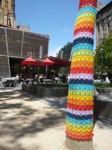 Just a quick one today – I know that yarnbombing is getting ubiquitous, but I’m still quite partial to it myself. Who doesn’t love rainbow trees and granny squares on the streets? These are all at the city square in Melbourne at the moment, so if you’re in town, stroll down for a look!