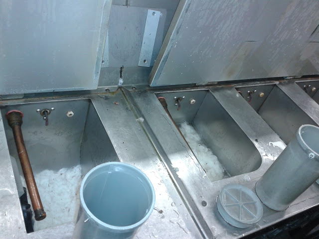 And after that the sample gets cut into two sections and goes through other tests, at which stage I think I got a bit busy explaining things to the Japanese clients because I don’t have photos! Anyway, at some point, all the seeds and burrs and bits and pieces that were stuck to the fleece are removed. This is done by running caustic soda through the fleece – the soda dissolves the fleece but not the grass seeds etc, so they remain after the fleece is gone…