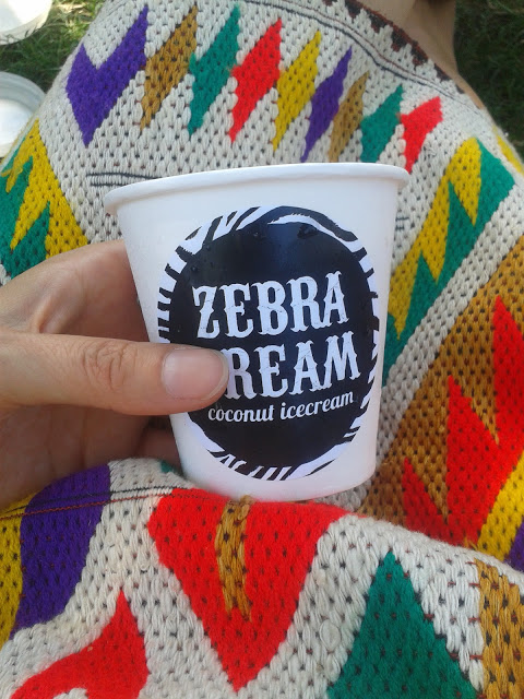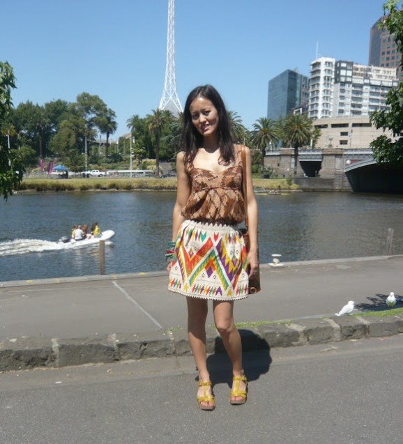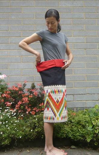 Step 6 is fairly easily achieved with an unpicker and a sewing machine. All I did was remove the patterned part of the sinh from the navy section above it and put a zip in the centre back seam. Then I just put it on and stood in front of the mirror, pinning small sections first on the left and then on the right of my waist, front and back, until the skirt fitted snugly. I stitched these tucks down and that was it! I was ready to hang out by the Yarra and enjoy some ice-cream at Melbourne’s Sustainable Living Festival.