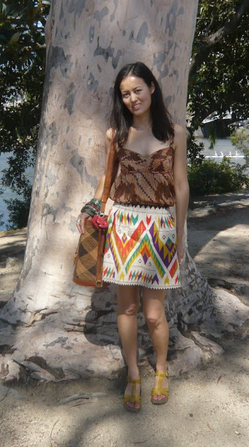 (My outfit is, as usual, pretty sustainable if I do say so myself… if you have only just tuned in, my skirt is made from a vintage Lao sinh but if I unstitch the tucks and take out the zip at the back, I can turn it back into a length of material; I made my top from batik material I found at an op shop; bag is from an op shop, most likely via Malaysia; bangles are from markets, op shops or friends… the only new things I am wearing are my shoes which are from Zomp.)