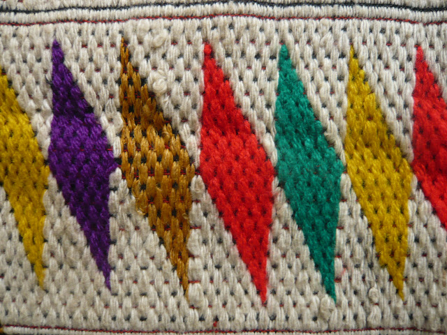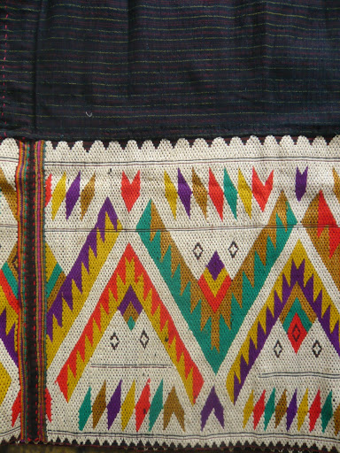 It’s a vintage sinh*, apparently from the Houa Phan region, where I have never been but am definitely keeping in mind as a shopping educational travel destination if there are more textiles like this to be found there. Despite all the delicate silk designs to be found in Laos, it’s the big, bold, graphic ones like this that are not so often seen that I tend to go for. I wonder if there is any meaning to this one or whether whoever made it just liked this kind of pattern?
