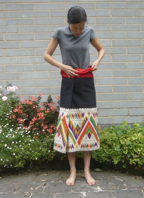 Anyway, the patterned part is actually just a width of woven material that has been stitched to two other lengths of material, one red, one navy with stripes, to form a sinh, the wearing of which I will now attempt to show you even though I have never worn one.