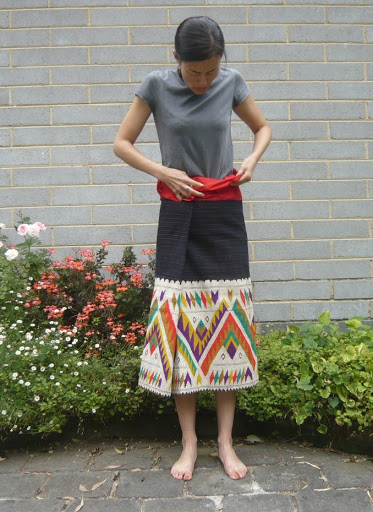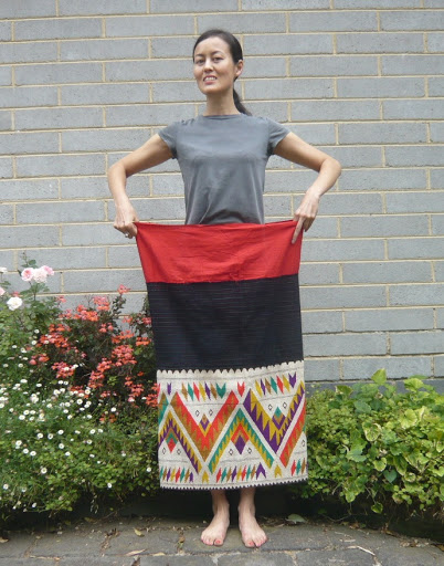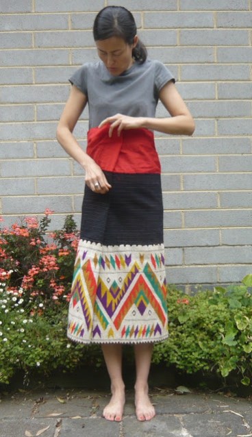 ラオスのマーケットでいろんな物を買ってきましたが、その一つがこのsinh (シン=ラオスの伝統的な織物で作られたスカート)。裾の部分がかなりボールドな柄で手作り感が大好きでしたが、買った状態のままではとても着れませんでした。なので、下の部分だけほどいて、ダーツをウェストのところに入れて、ミニスカートにしました。しかも、一才切っていないので、もしミニスカートに飽きたら、またほどいて、家でのデコレーションなどに戻すことができます。どうですか?こういうエスニックな生地、普段着として着こなしてみませんか?