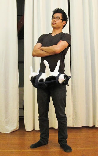 Yep, a man who’s prepared to wear a harness around his waist to ensure a cat’s comfort. You’re welcome.