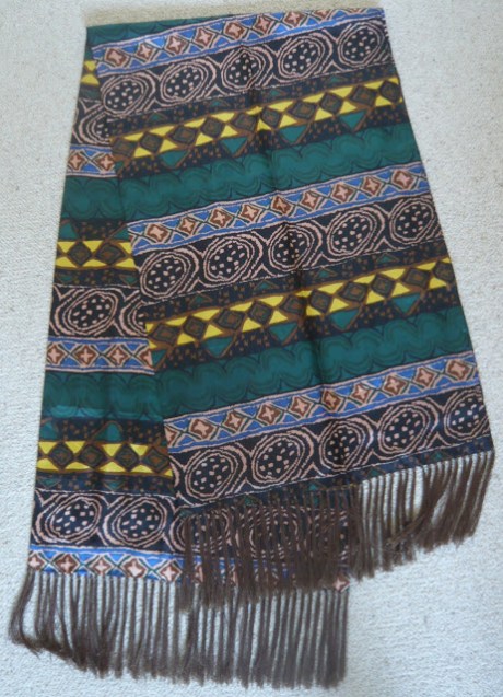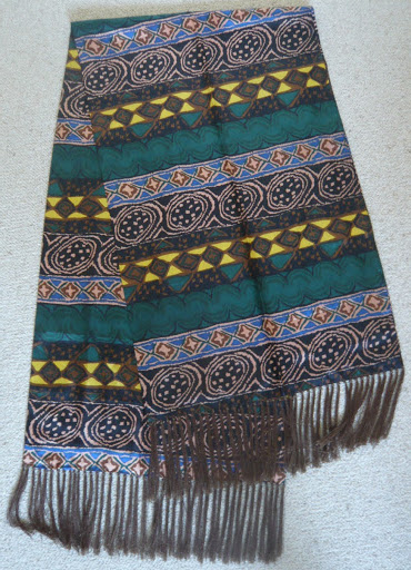 I put my mind to the task at hand and found a patterned silk scarf with fringing for $6…