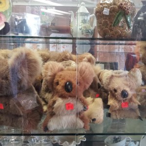 This mood hat I found in an op shop in Dandenong didn’t have “excited” and “lucky”, but that’s how I was feeling last Friday as I set off with Candice and Cecylia on an op shop odyssey down to the Mornington Peninsula, where we had been invited to participate in a bloggers’ weekend. A friend of mine had supplied us with a 9-page list of op shops, and although we didn’t get to all of them, we gave it a red hot go and discovered wacky and wonderful stuff along the way, like this cabinet full of koalas…