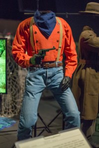There are lots of insights such as this throughout the exhibition from costume designers and actors too – I loved reading about how cowboys and ranch hands choose different brands of jeans and styles of hats depending on their roles and which state they are working/living in. John Wayne chose this kind of costume with the double breasted shirt and kerchief which he wore in so many of his films (this one is from The Searchers) because it was fairly true to what contemporary wild west residents would have worn.