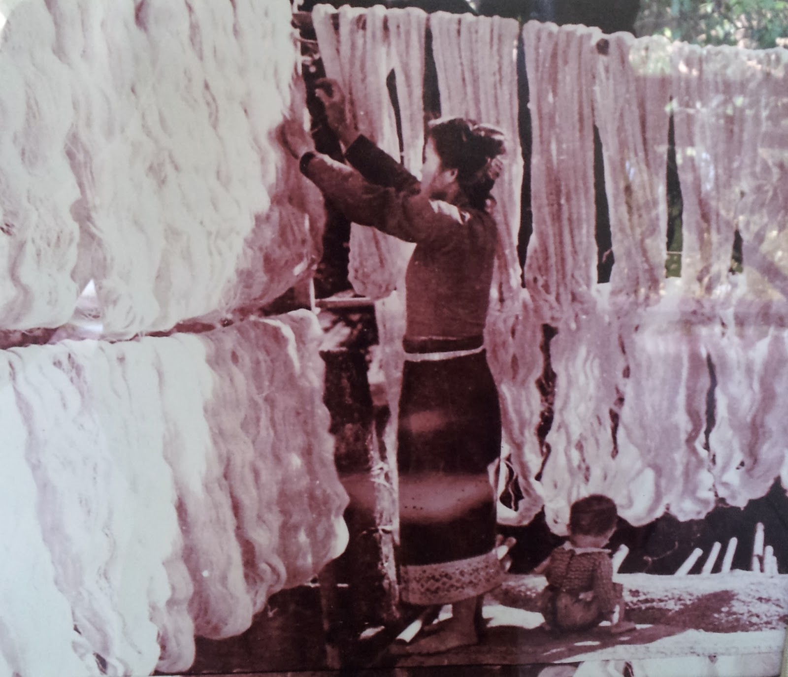Here’s a lady hanging out skeins of thread before weaving. This procedure is probably fairly much the same now…