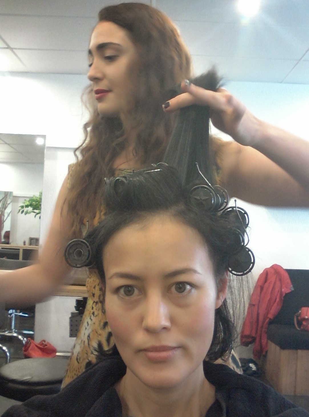 We decided to see whether I’d be able to do a glamorous retro style like some of the other looks Nicole Warne showcases on her blog (she looks so beautiful in every shot that Lisa and I got a little bit distracted scrolling through the images!) so it was out with the hot rollers…