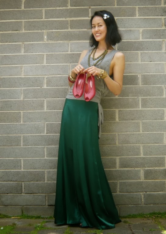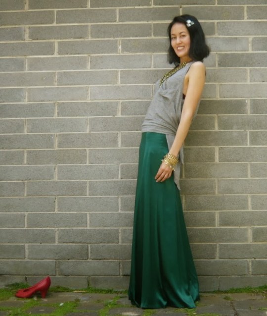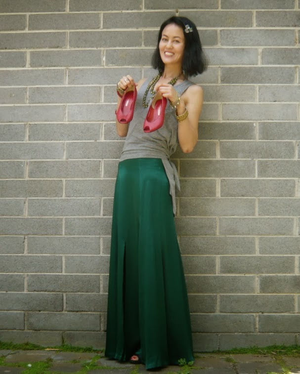 Something else to celebrate was finding this skirt and shoes (in such obviously Christmassy colours that I couldn’t resist this festive-themed post). The skirt is pure silk, reminds me of Keira Knightley’s infamous dress in Atonement, and (drumroll) was $5 at Uniting Care’s op shop in Dandenong. I was kind of trying to channel Keira’s look and hair when I put this outfit together (very “kind of”!!).
