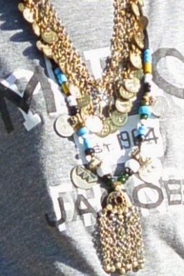 My sunglasses are by Dolce & Gabbana from a few years back, T-shirt is old Marc Jacobs that I received as a press novelty gift when I was working in Tokyo, and the shoes are Bally Jeunesse, from the Salvos. Given the money theme of the Monopoly (sorry, Moschinopoly!) print, I chose accessories made from coins – one that I made from a bellydancer’s chain, the other was a gift from a friend who visited Dubai.