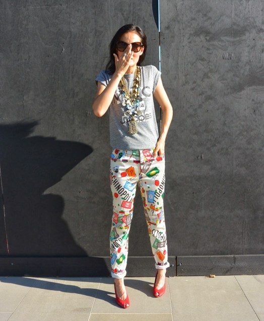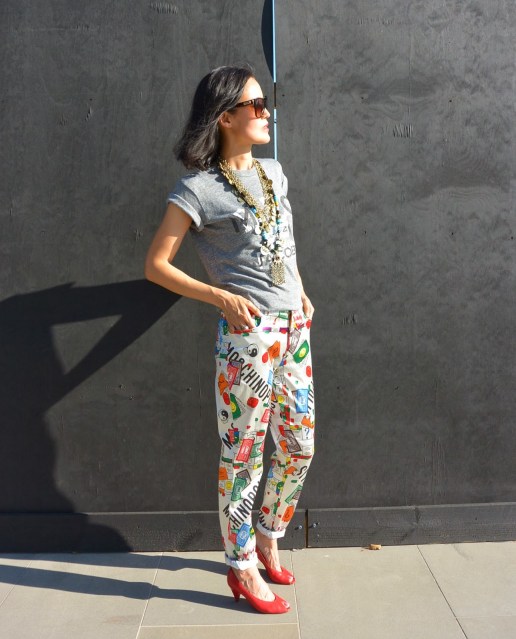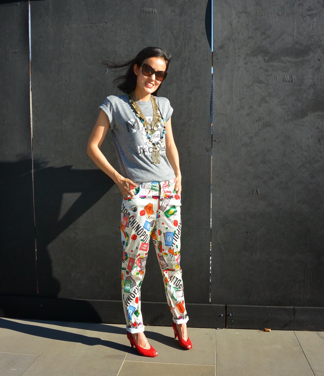 Loving all of the pants!!! Especially the Moschinopoly's! They really look good on you!! If you ever want to part with them holler. I love all things novelty print :):) Also those pink pants are killer! I can't believe you made them!!! Also completely fabulous!!! Haven't seen you all new year OR Chinese new year! We must change this 🙂