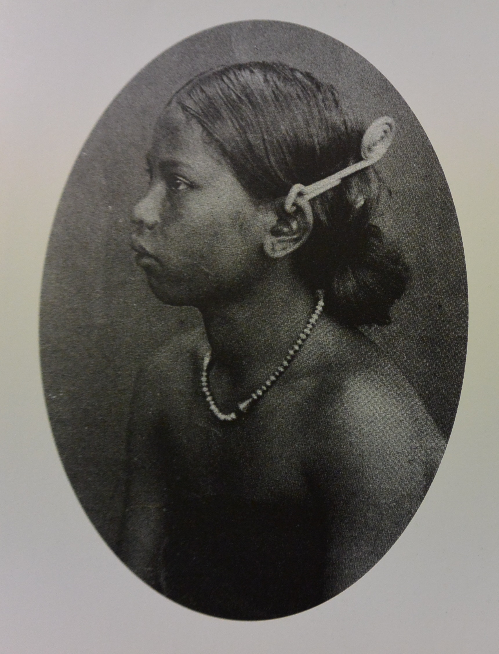 Apparently it is attached to the upper ear and the head cloth, but in this picture it seems to be defying gravity somewhat and there is no head cloth in sight. I love the look of it and want to try to make one for myself, although the most practical material I can think of to use is a pipe cleaner, which might not look quite as chic…
