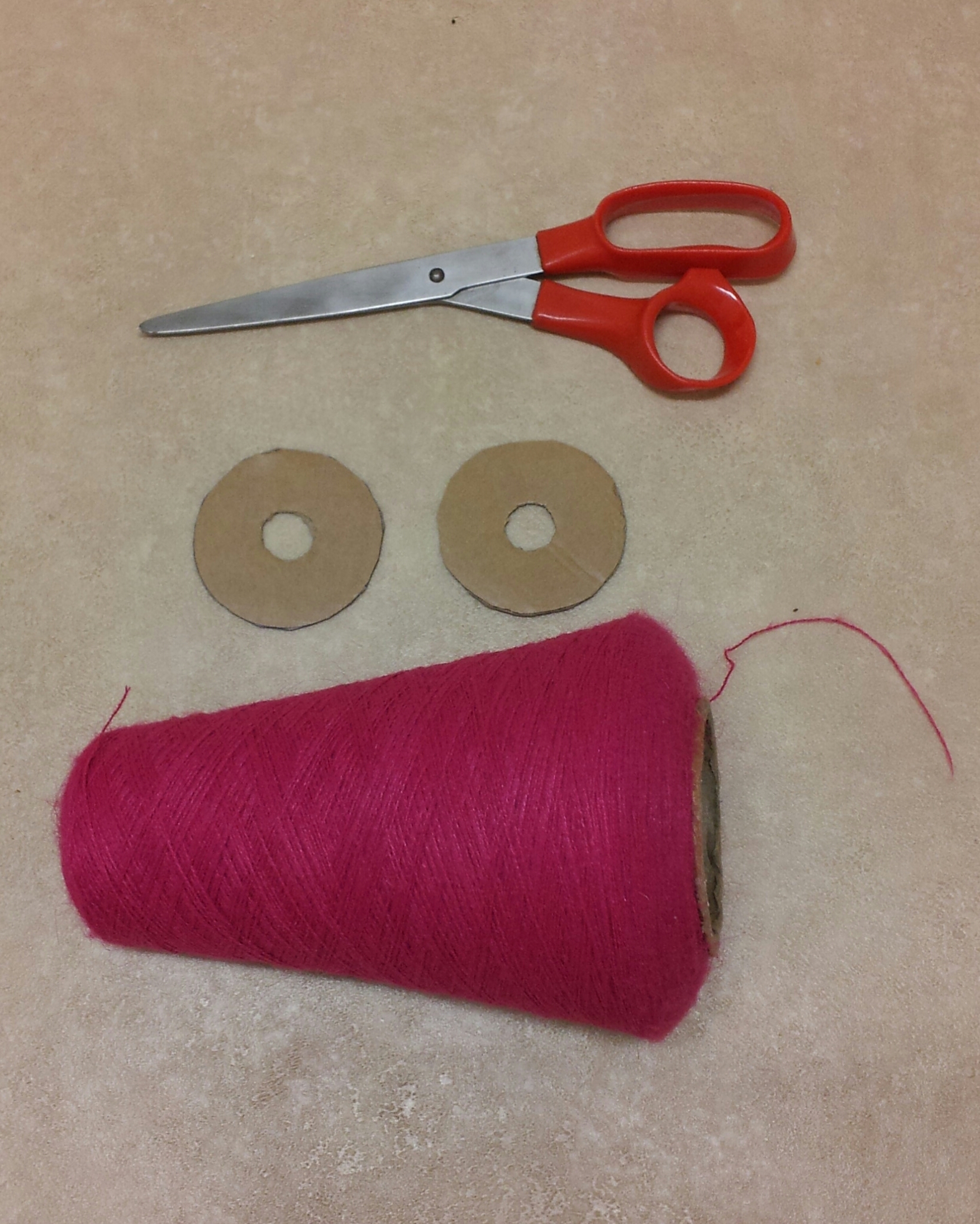 You will need sharp scissors (nail scissors might be a better bet than these ones), two identical donut-shaped pieces of sturdy cardboard the size you want the pom pom to be, and of course some kind of yarn. I found this massive cone of acrylic thread at an op shop years ago and have been trying to work my way through it ever since.
