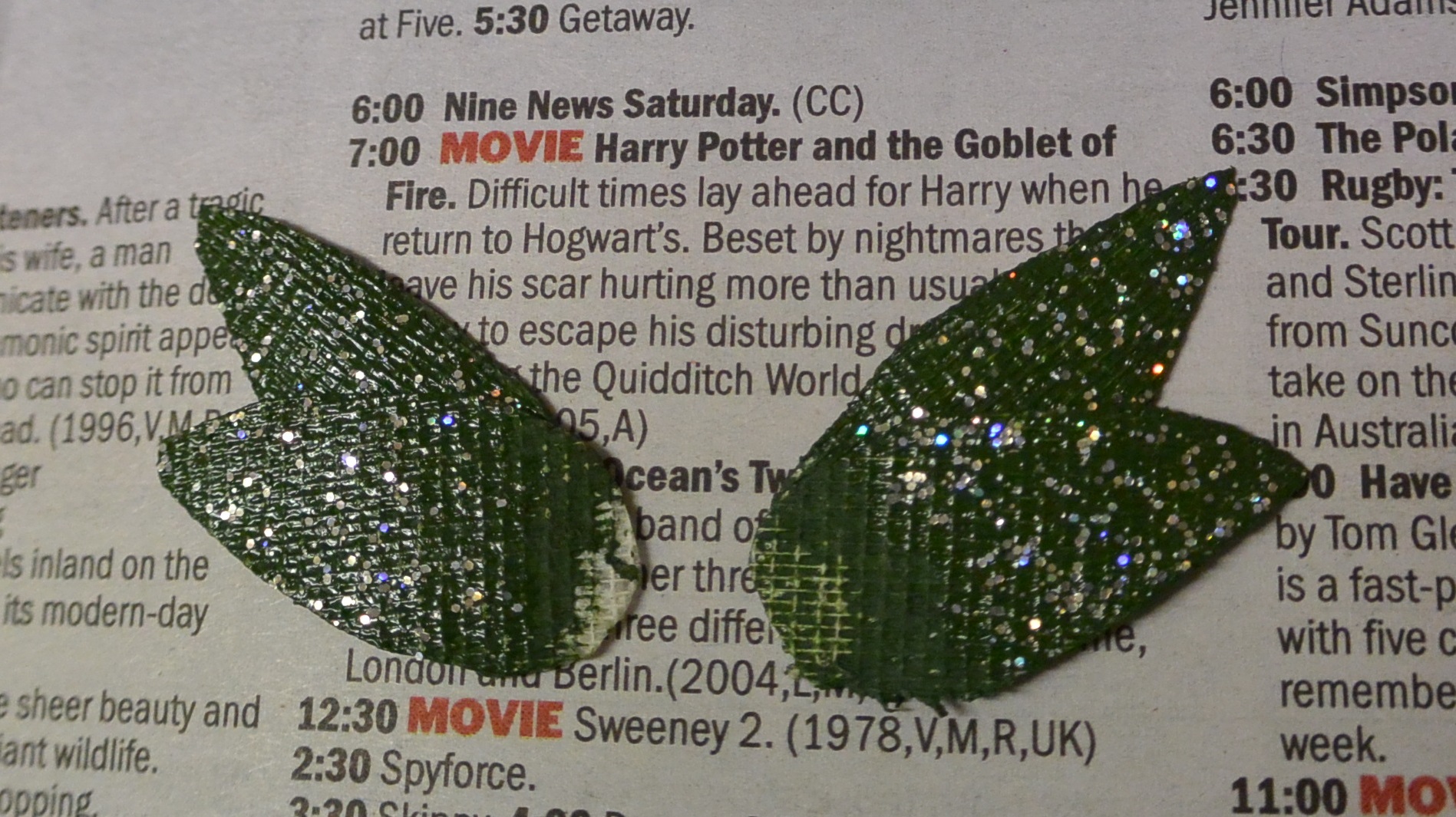 …then painted them green on both sides using normal paint (but I suppose you could use fabric paint or nail polish, depending on the effect you want).