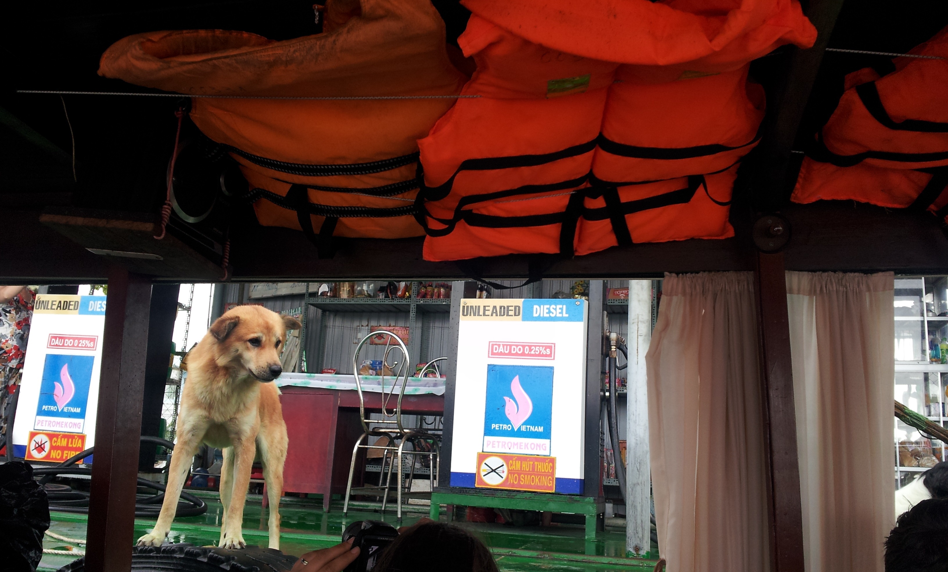 A floating petrol station for boats that chug along the Mekong was kind of entertaining, thanks to the canine attendants.