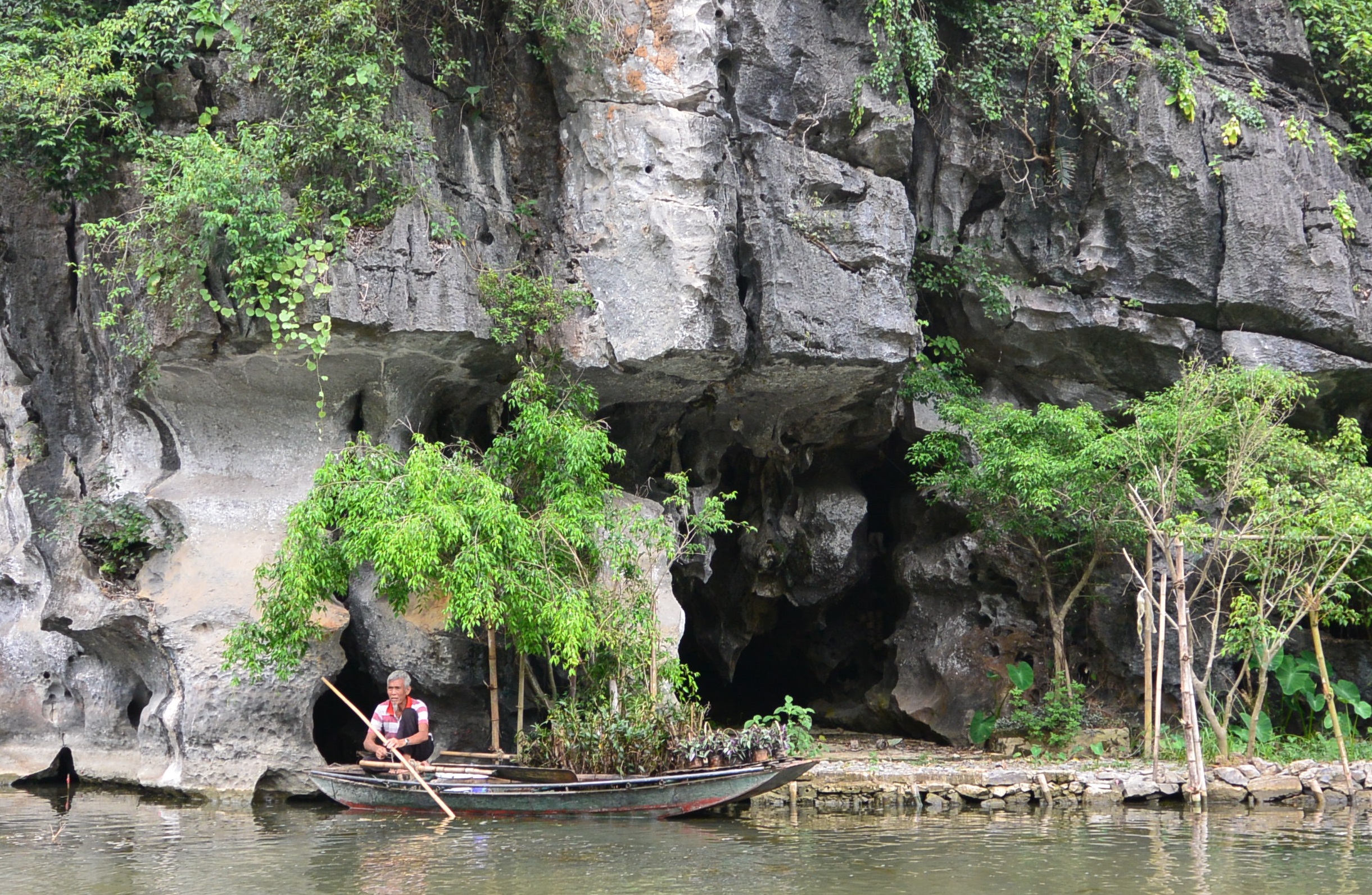 I didn’t see this anywhere else either – a guy selling plants from a boat parked in the middle of nowhere under the cliffs. I’m not sure who his target market was because I don’t think any tourists would buy them! Anyway, his entrepreneurship made for a nice photo – as did this scenery the next day at Trang An. It’s not far from Tam Coc but the plant life is a lot more lush, and it’s recently been given UNESCO status (as in, about a month ago!).