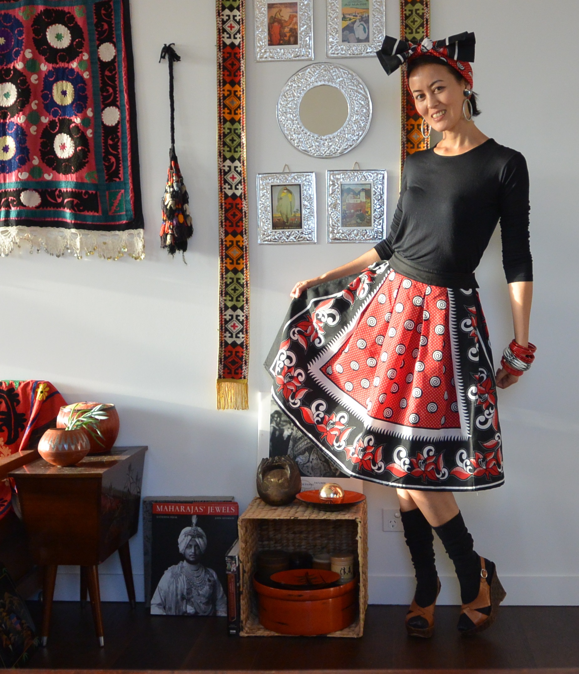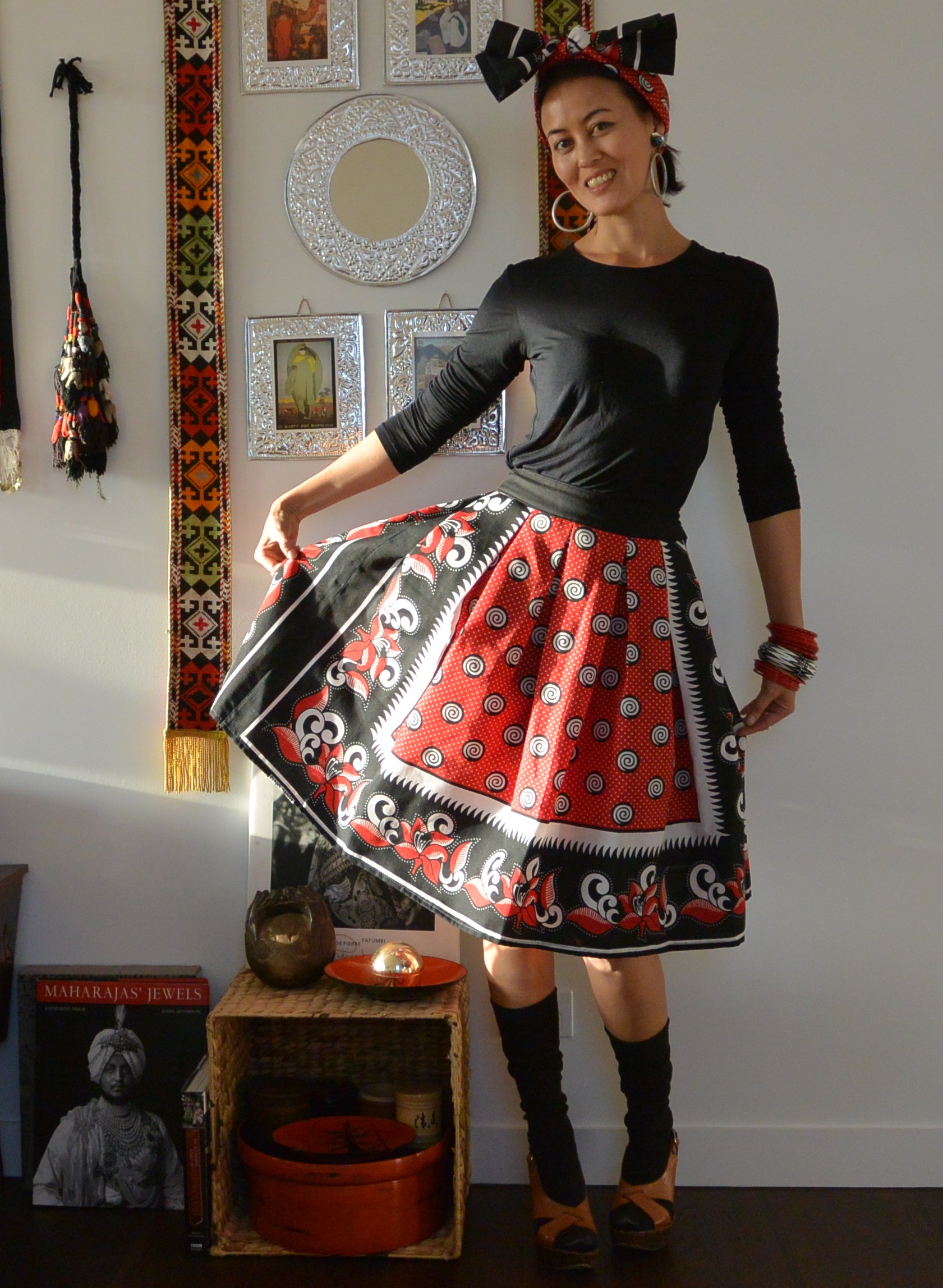 I folded the tablecloth in half longways, cutting out the centre strip with the textile workshop name on it to use as a headscarf. Then I sewed the two remaining large rectangle bits together at the side seams and made box pleats around the waist, adding a zip at the side and a waistband made from other black material I had lying around (those odd scraps always end up coming in handy eventually!). The material is quite stiff, which makes the skirt naturally swingy, although it might go a bit softer once washed.