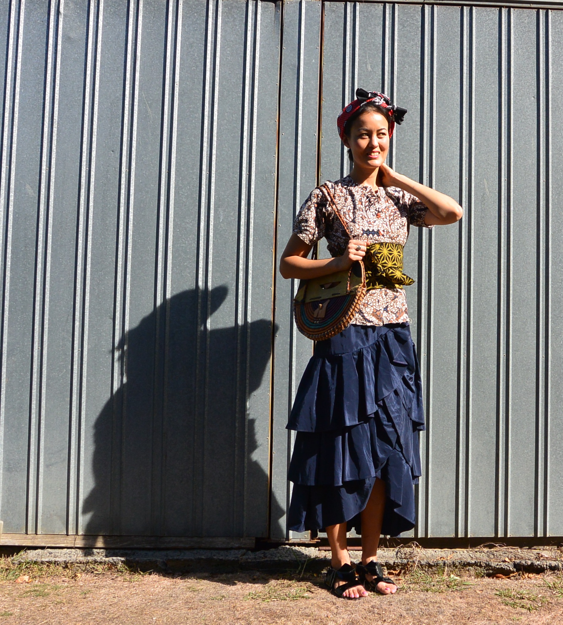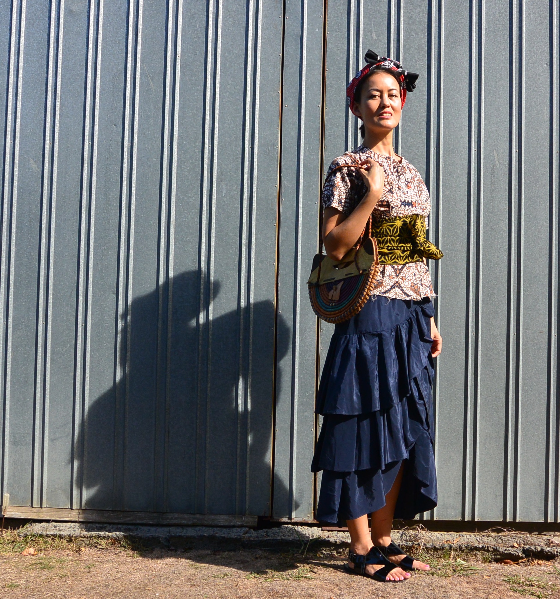 Even though the ruffles and semi-shiny fabric make this skirt seem a bit fancy, the navy colour means it lends itself to all kinds of looks and pairs well with all kinds of patterns, including my favourite batiks and ikats.navyskt12