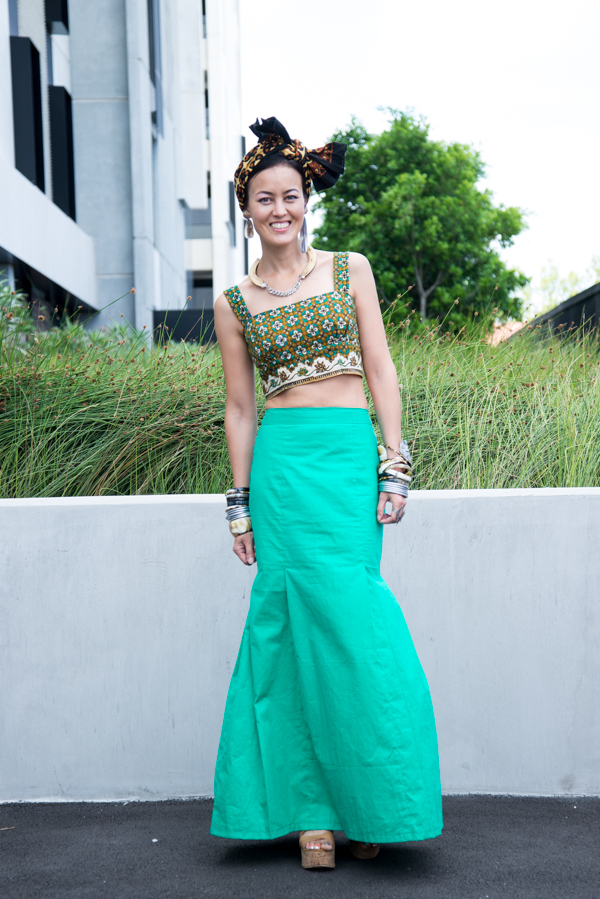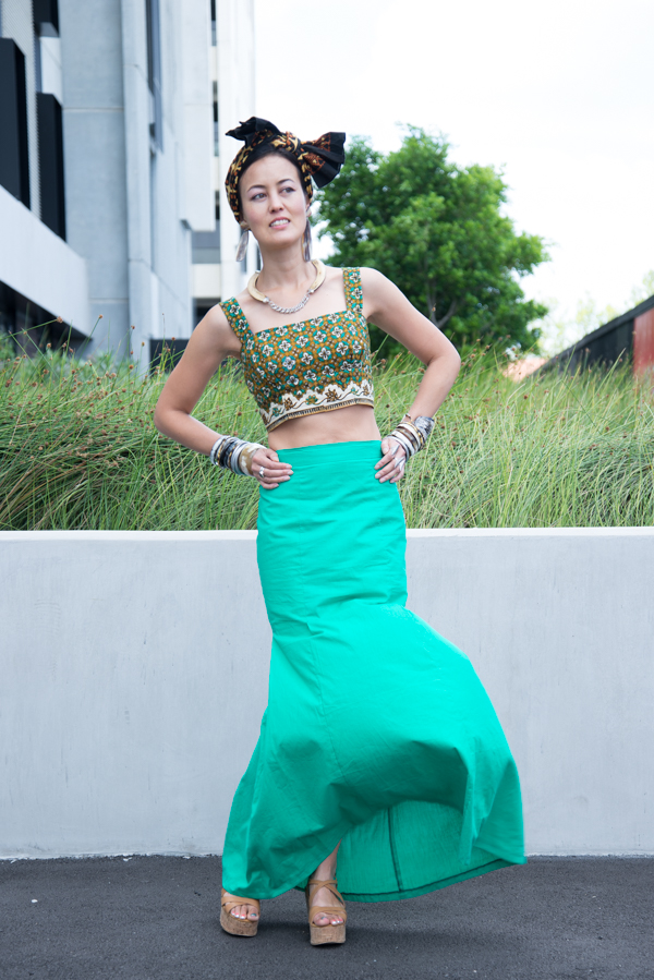 *It hardly needs to be said, but all jewellery and accessories in these photos are from opshops, markets, were received as gifts or made by me… as usual! Oh, and the batik bustier was a last-minute summer project to finally use up scraps of material from this top and skirt twinset – you can see me wearing it here too.