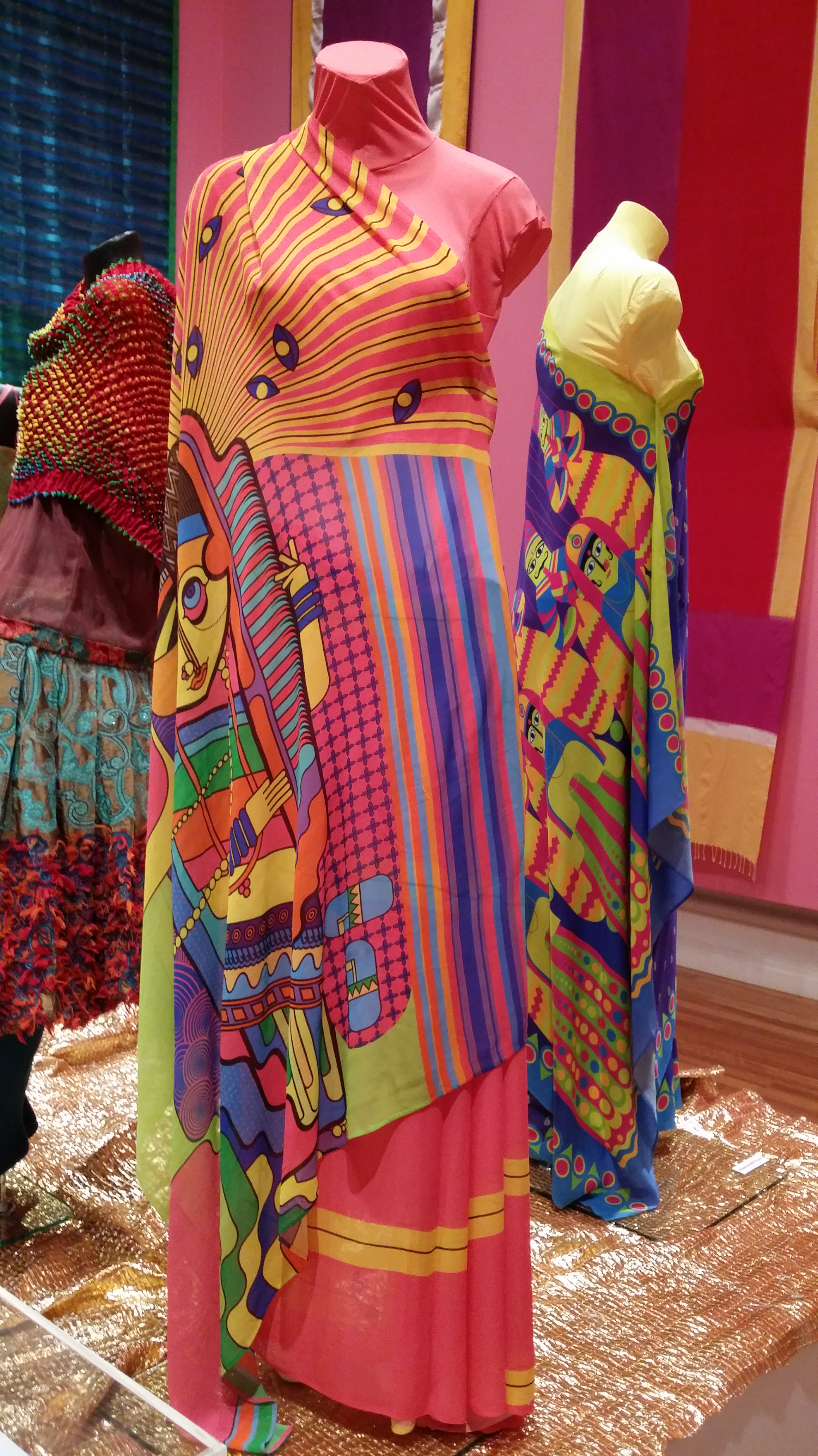 Unlike at the Chinese exhibition at the NGV, there was no guided tour here, but I could still tell that there were a lot of different techniques on display – shibori (although it’s probably called something else in India!) in the shawl on the left for instance. And colour EVERYWHERE.