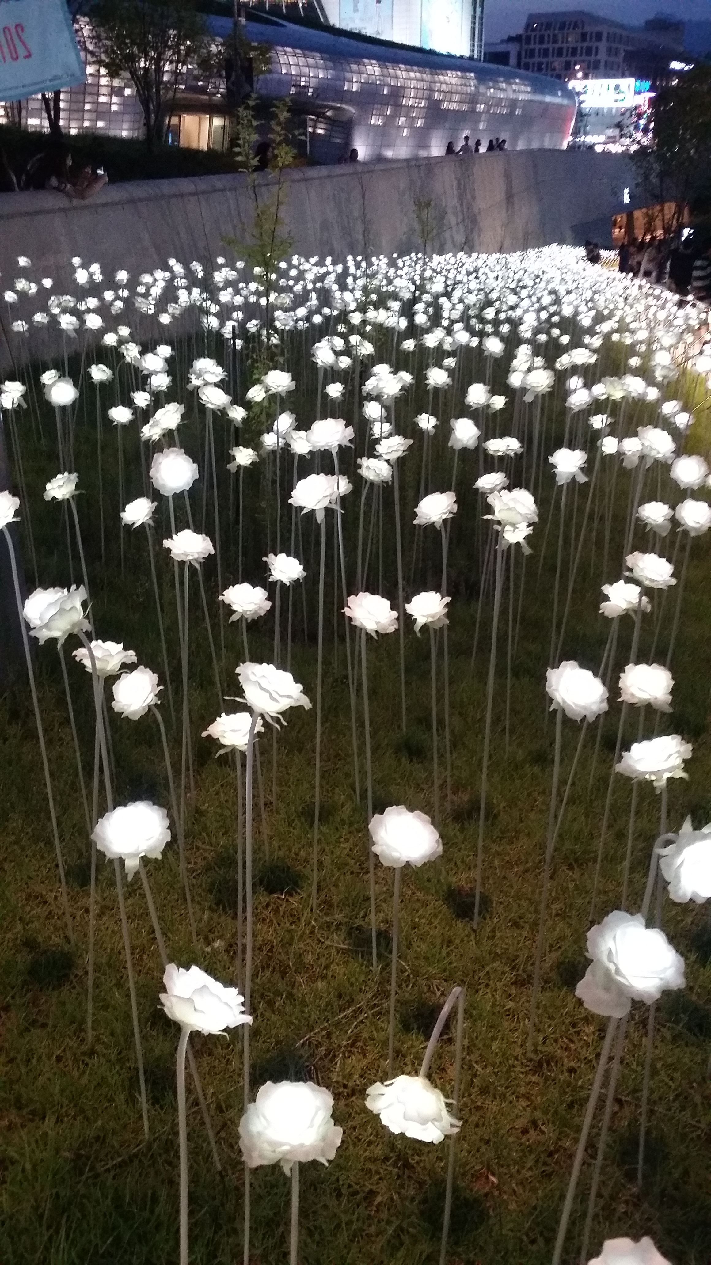 Evening is also a good time to head to Dongdaemun Design Plaza because it’s when the field of white LED roses is lit up…