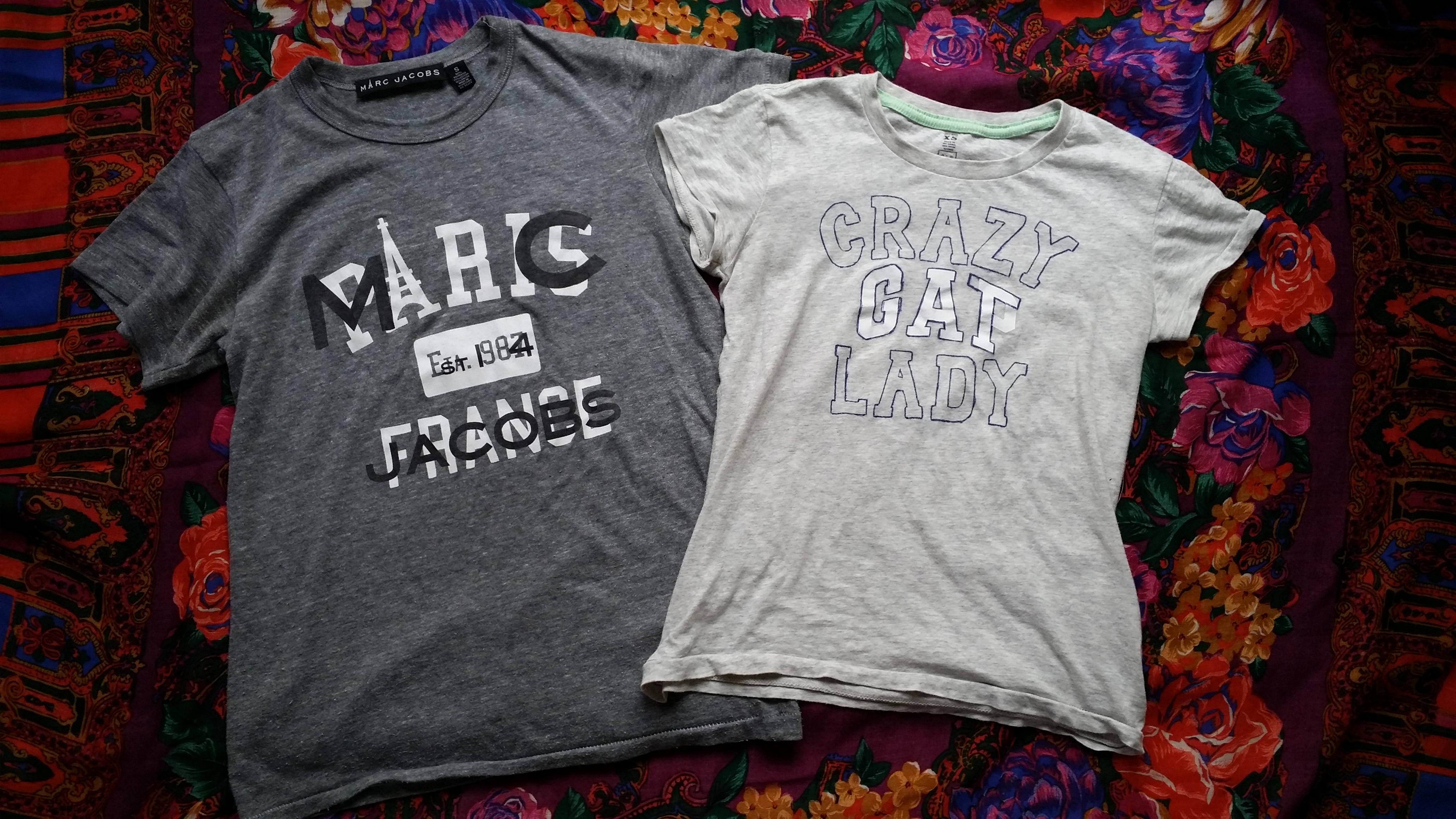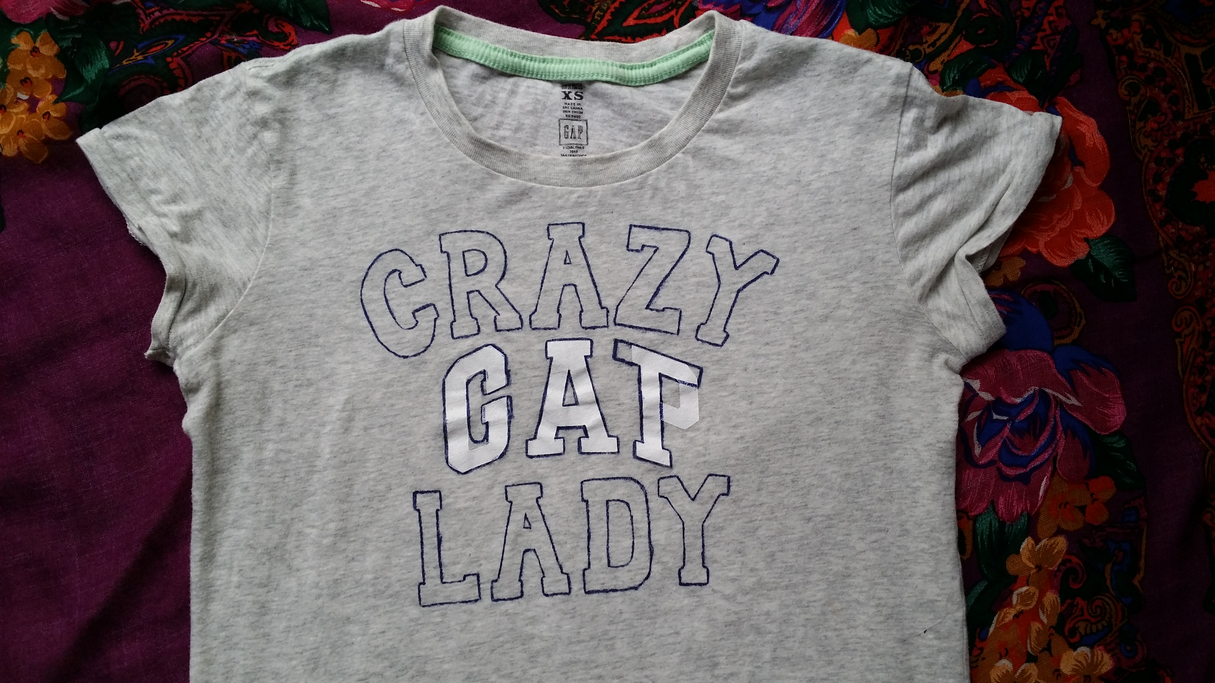 This project actually was not too difficult, just a little bit time consuming. I drafted up some letters in a similar font to the one used for GAP, cut them out and traced around them in fabric marker (no step-by-step photos for that as I needed both hands and didn’t want to smudge the ink!). And then I turned GAP into CAT. (If you’re going to attempt something similar, make sure you pad out the T-shirt to about your size, especially if it is a stretchy fabric, and then slide something flat like a magazine underneath to use as a work surface.)