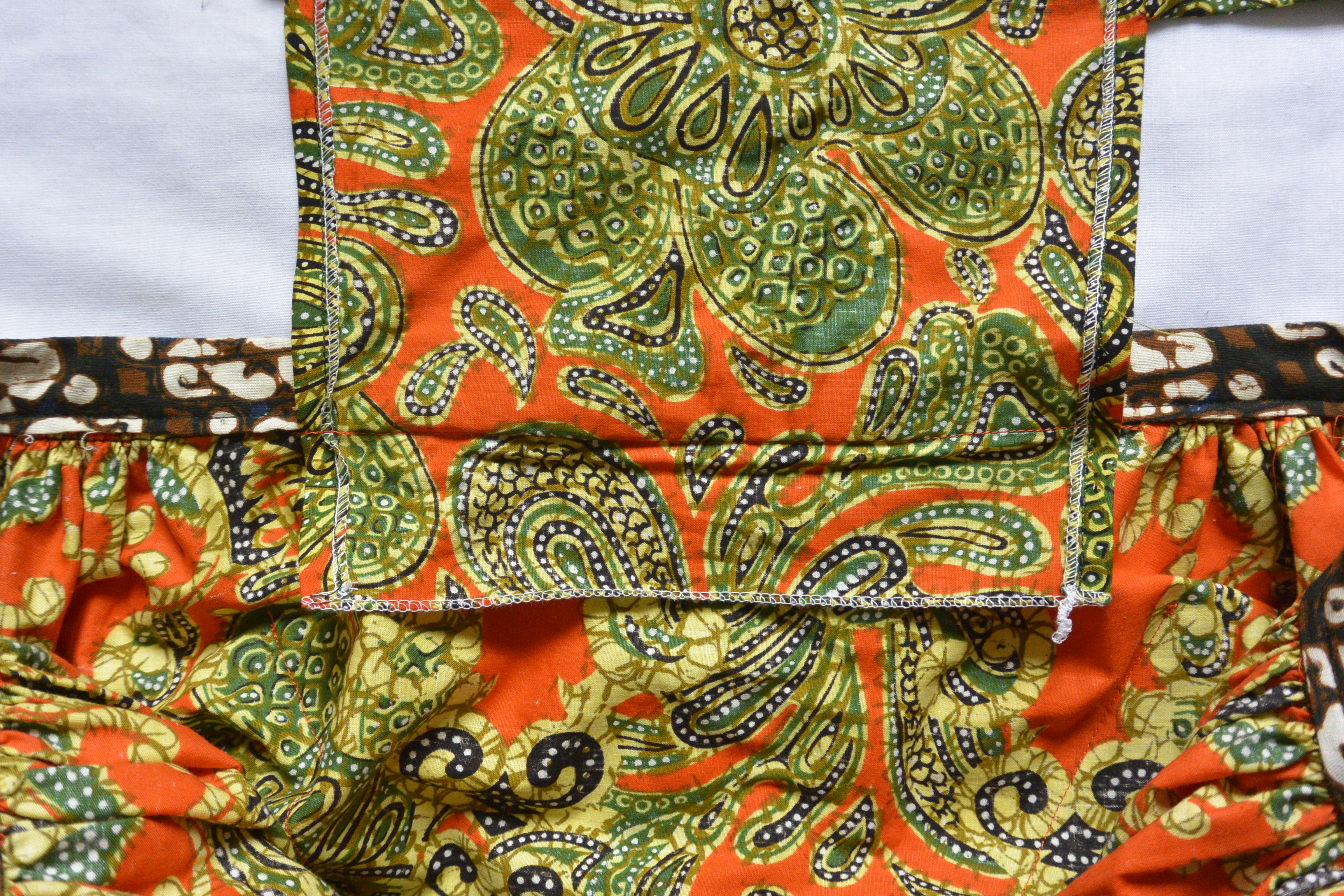 The original rectangle of fabric measured about 110cm wide x 230cm long. I took off about a 5cm strip all the way along the length to use as straps, ties and the waistband. I then cut off 25cm from the main piece of fabric which became the two square pockets, bodice and side sections. So the skirt was made from a big rectangle about 105cm wide (ie the length from waist to the floor) and 205cm long (which I gathered to fit my waist).** I used a strip left over from the other batik skirt to line the waistband as you can see in this shot which shows the inside of the bodice: