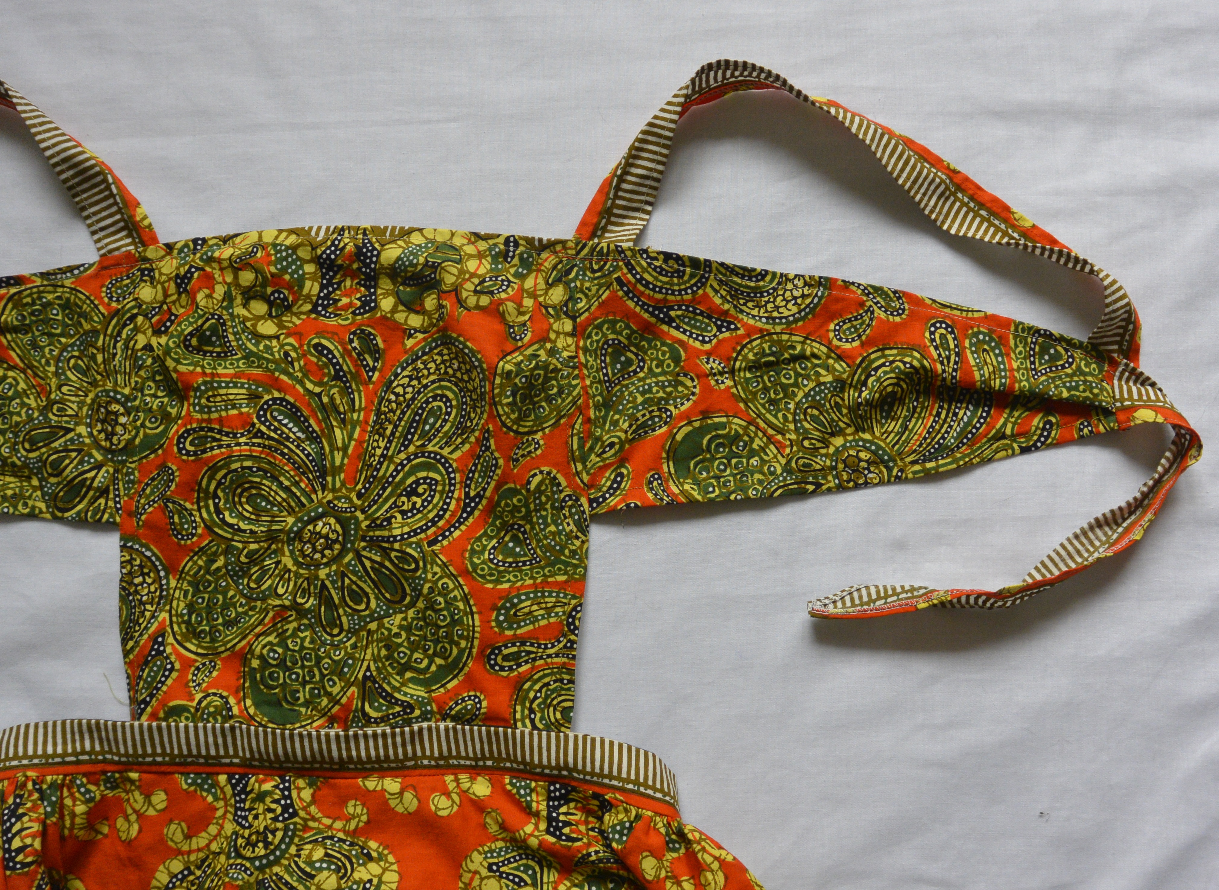 My aunt (my dad’s younger sister, ie on the Malaysian Chinese side of the family) recently invited me to go through her fabric stash and take whatever I wanted, the result being that I came home with this batik fabric that hadn’t even been taken out of its package, probably since my aunt received it as a gift in the ’70s. Soooo much orange… so much pattern… so much for me (and probably hardly anyone else) to love!