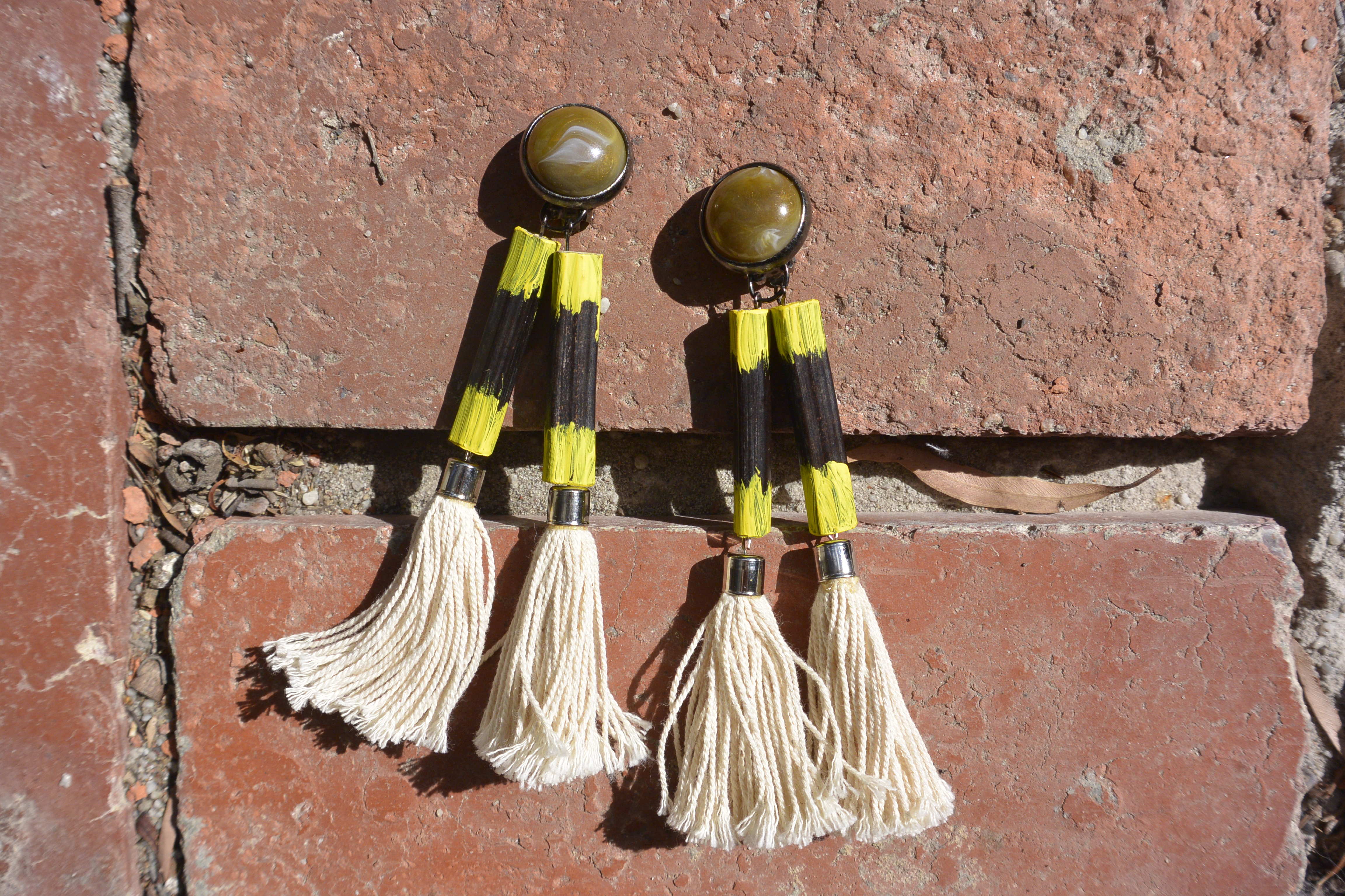 And then the even more fun bit… assembling the earrings using odds and ends from my stash (clip-on earrings, long eye pins, tassels and jump rings). It’s easy to add dangly bits to clip-ons if you put a jump ring over the base of the clip.