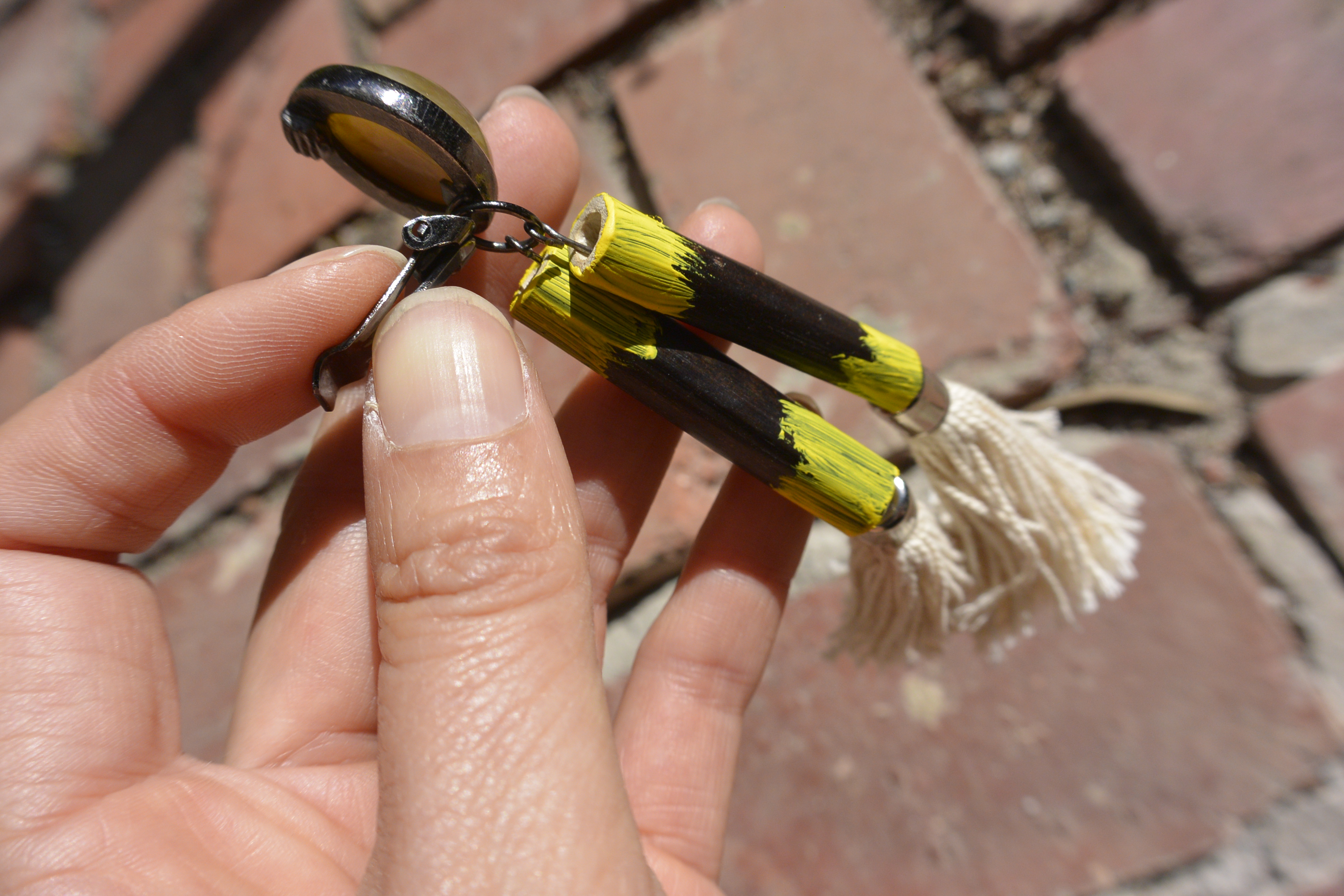 They would have looked a bit boring in plain black so I painted them yellow at each end – if you want to do something similar with plain tubular beads I recommend using skewers like these as it makes it easier to paint them.
