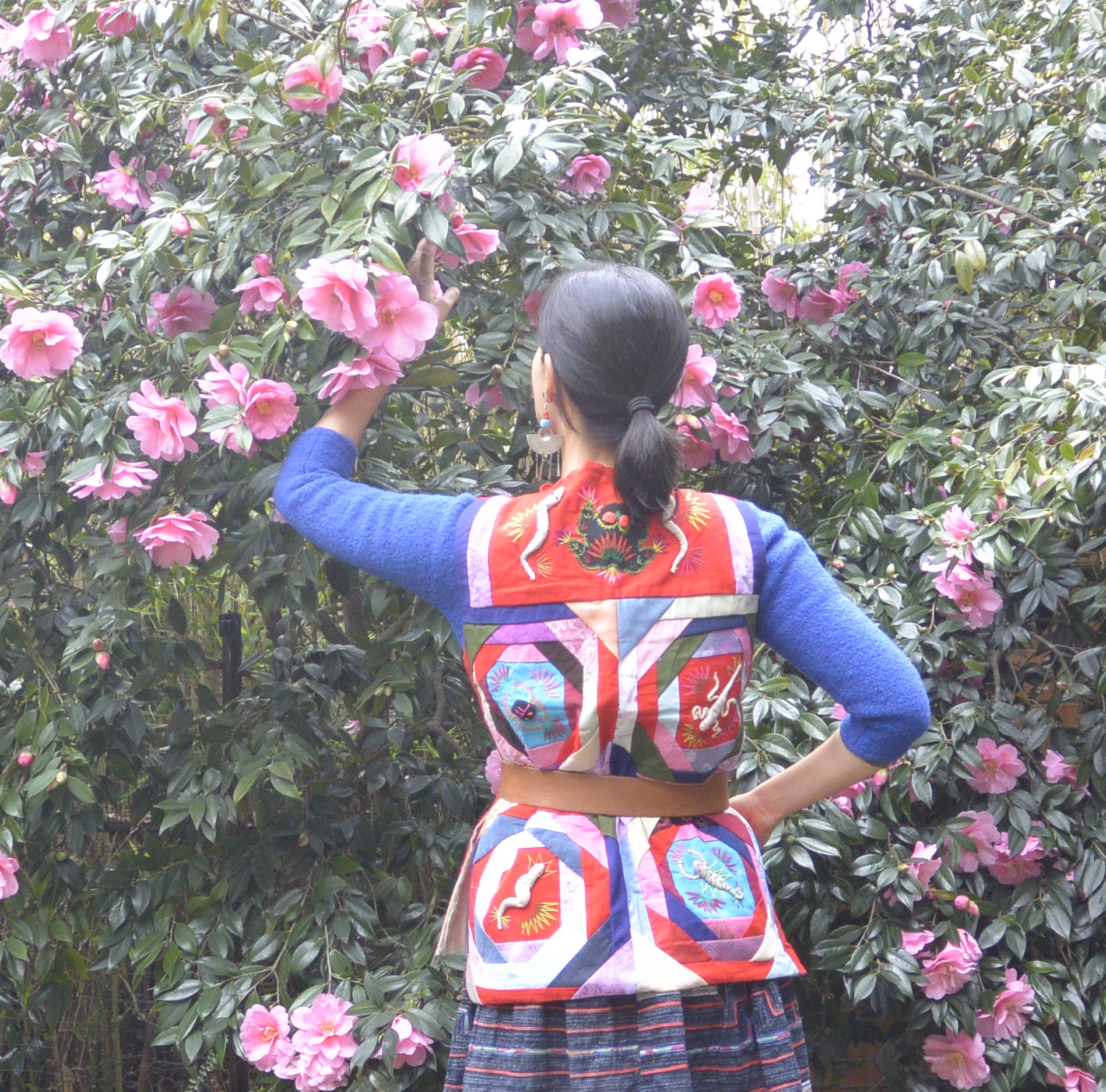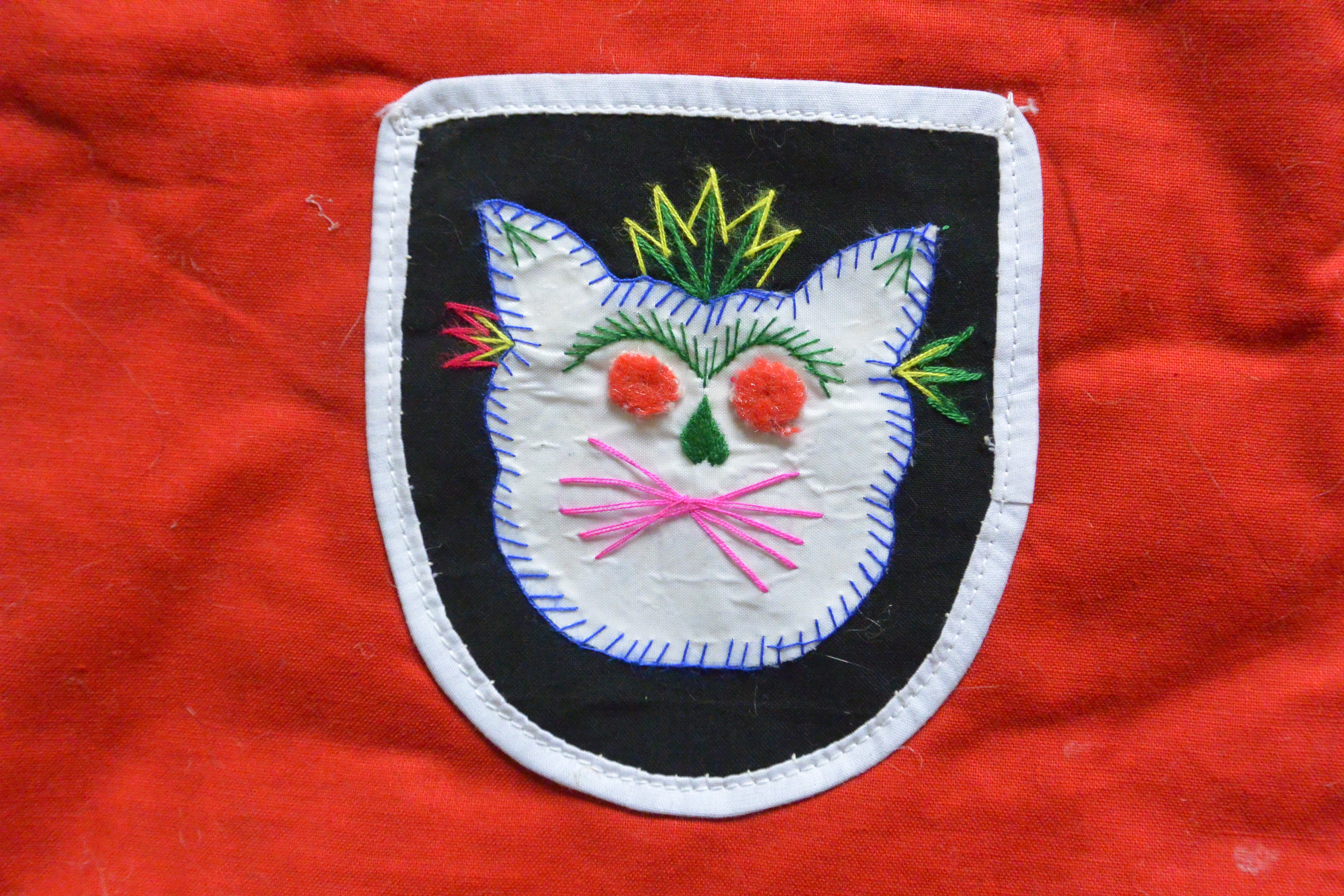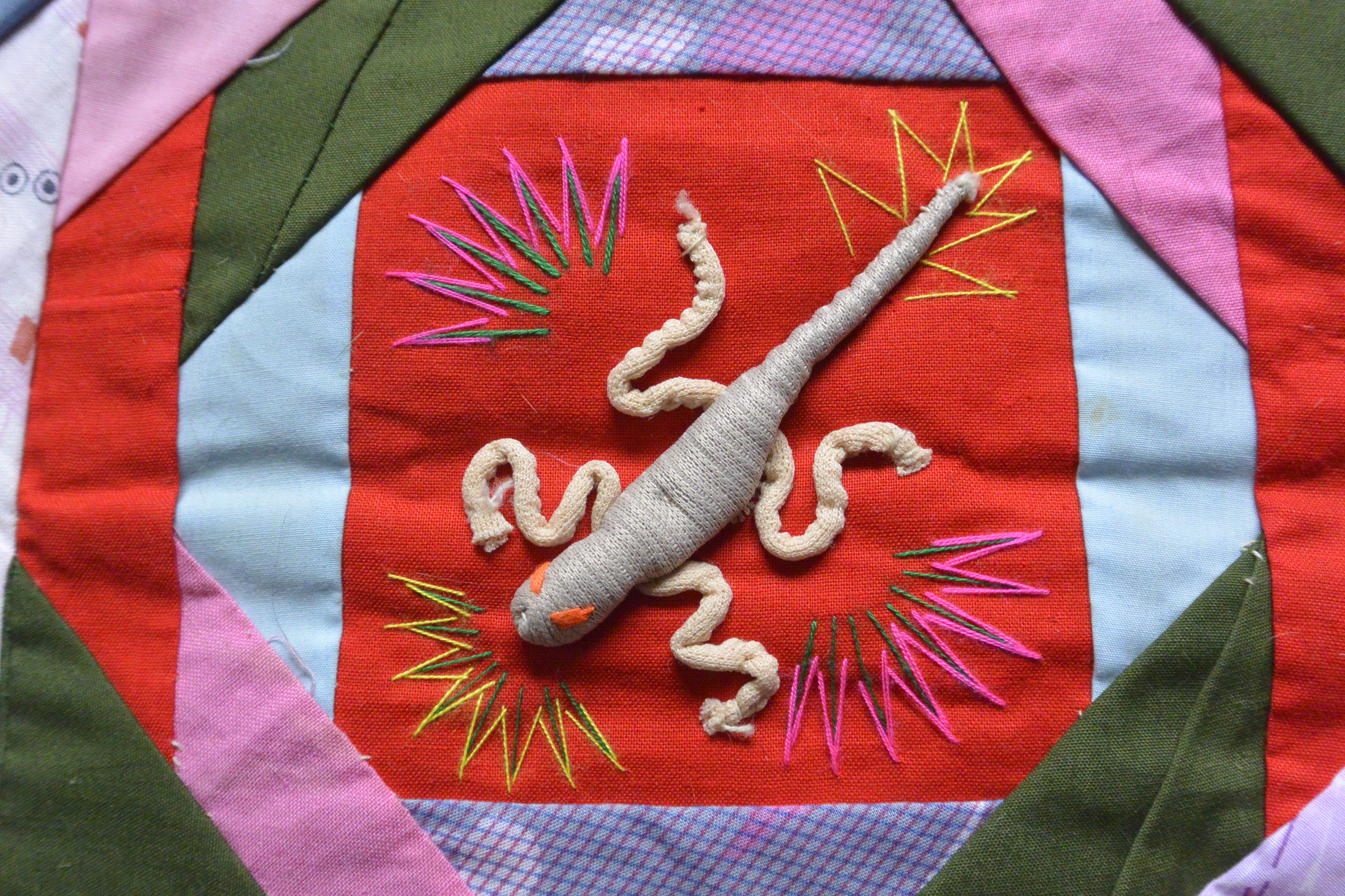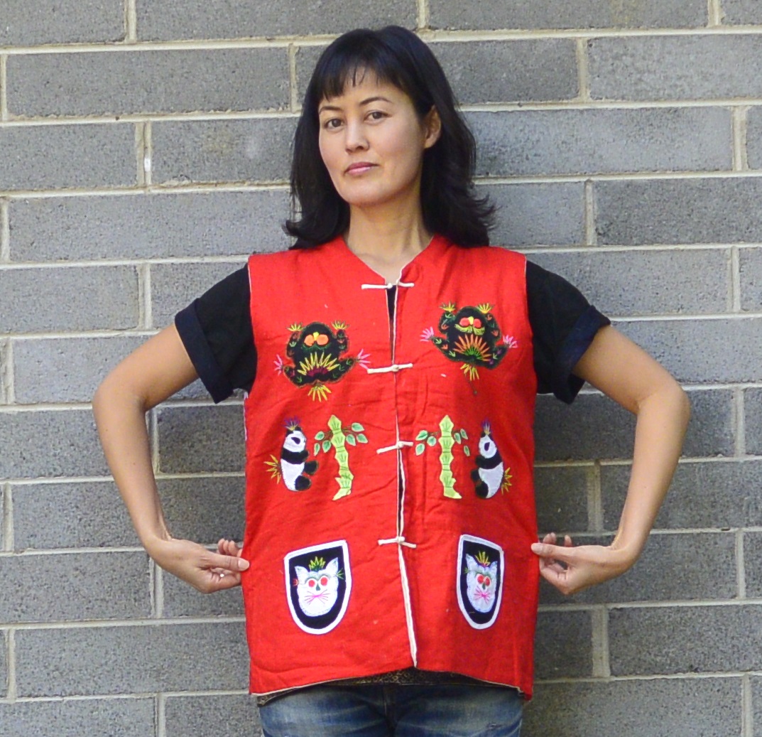 I bought this vest at a church fete last year for the princely sum of $2. It was hanging on a rack with an ancient supermarket bag wound around the hanger which contained an embroidered hat with black yarn plaits attached. This made me think maybe the vest (and hat) was some kind of theatrical costume, but when I did a bit of Googling, I found out that the vest is appliqued with “five poisonous creatures” and given to kids to be worn as protection from them in May, which is traditionally when farmers try to rid their land of pests.