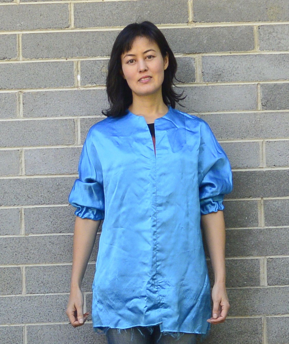 Originally it was a hip-length kind of bomber jacket with no front fastenings, elastic around the bottom and plain, loose sleeves. It was handmade, perhaps for fancy evening events. I’m sure I took photos of it as-was when I bought it, but can’t find them, so this is the most “before-y” shot you’ll get. It shows how I unpicked the hem and removed the elastic from there, sewed the fronts together to make it into a tunic and added elastic in the cuffs.