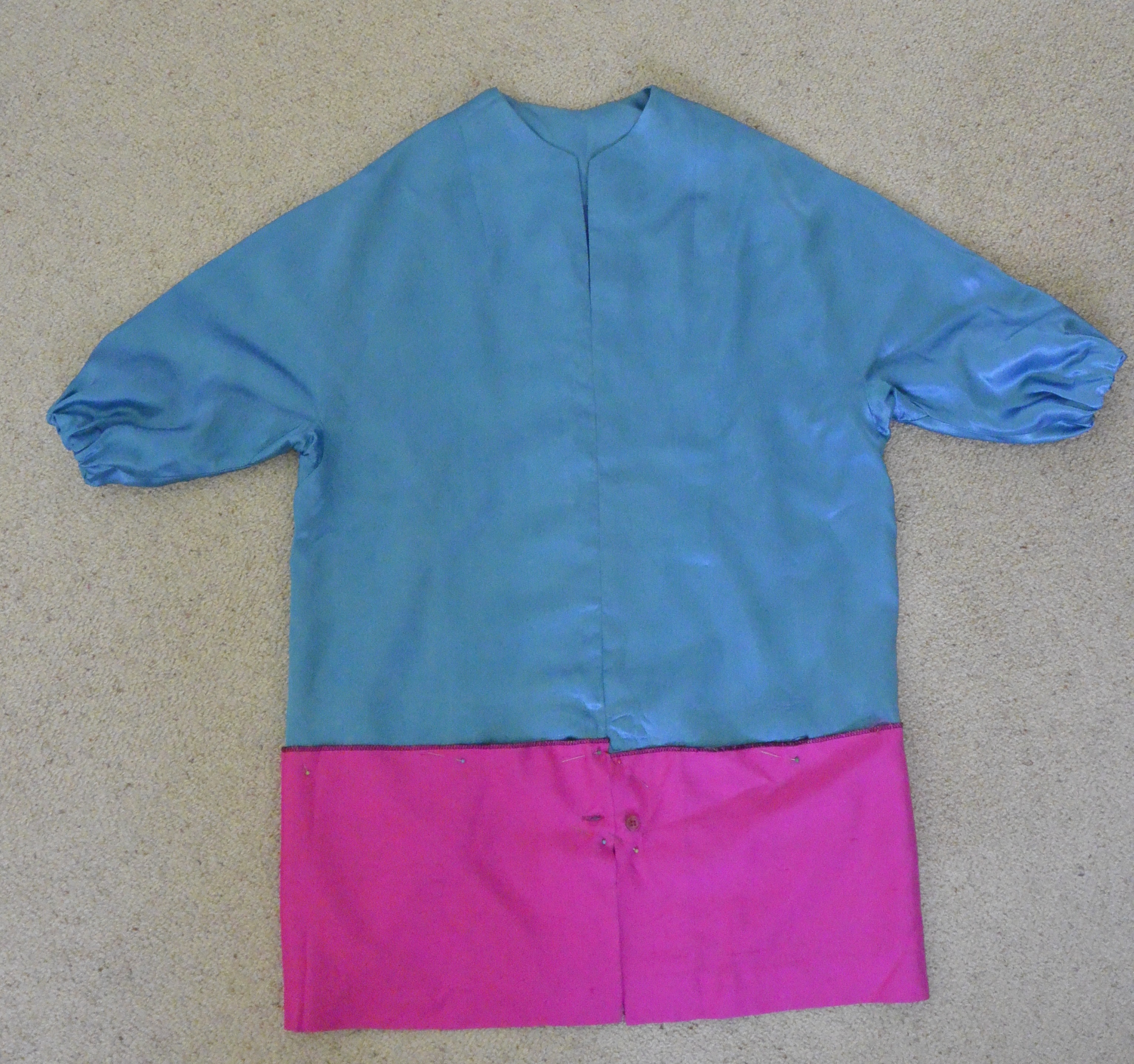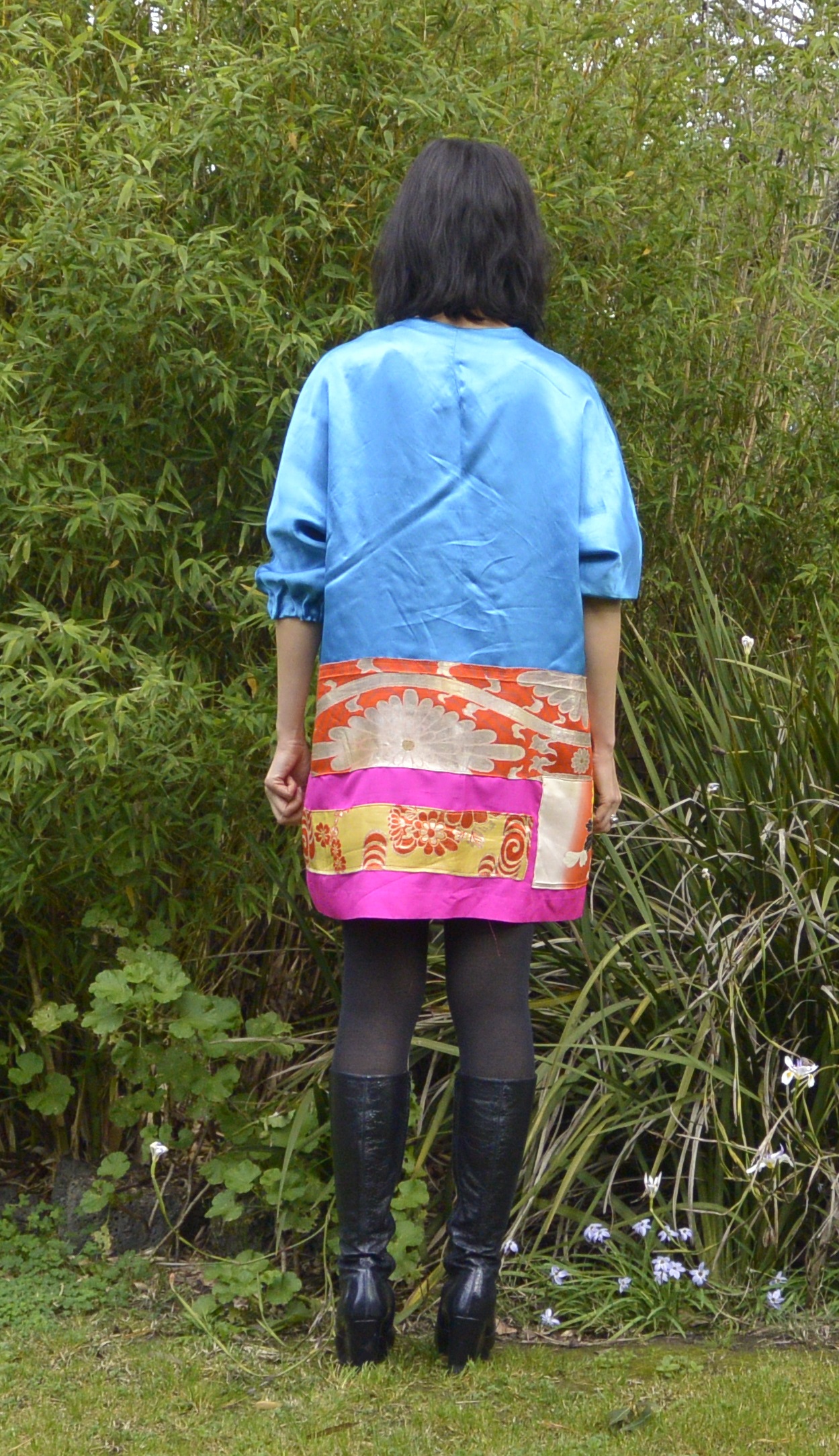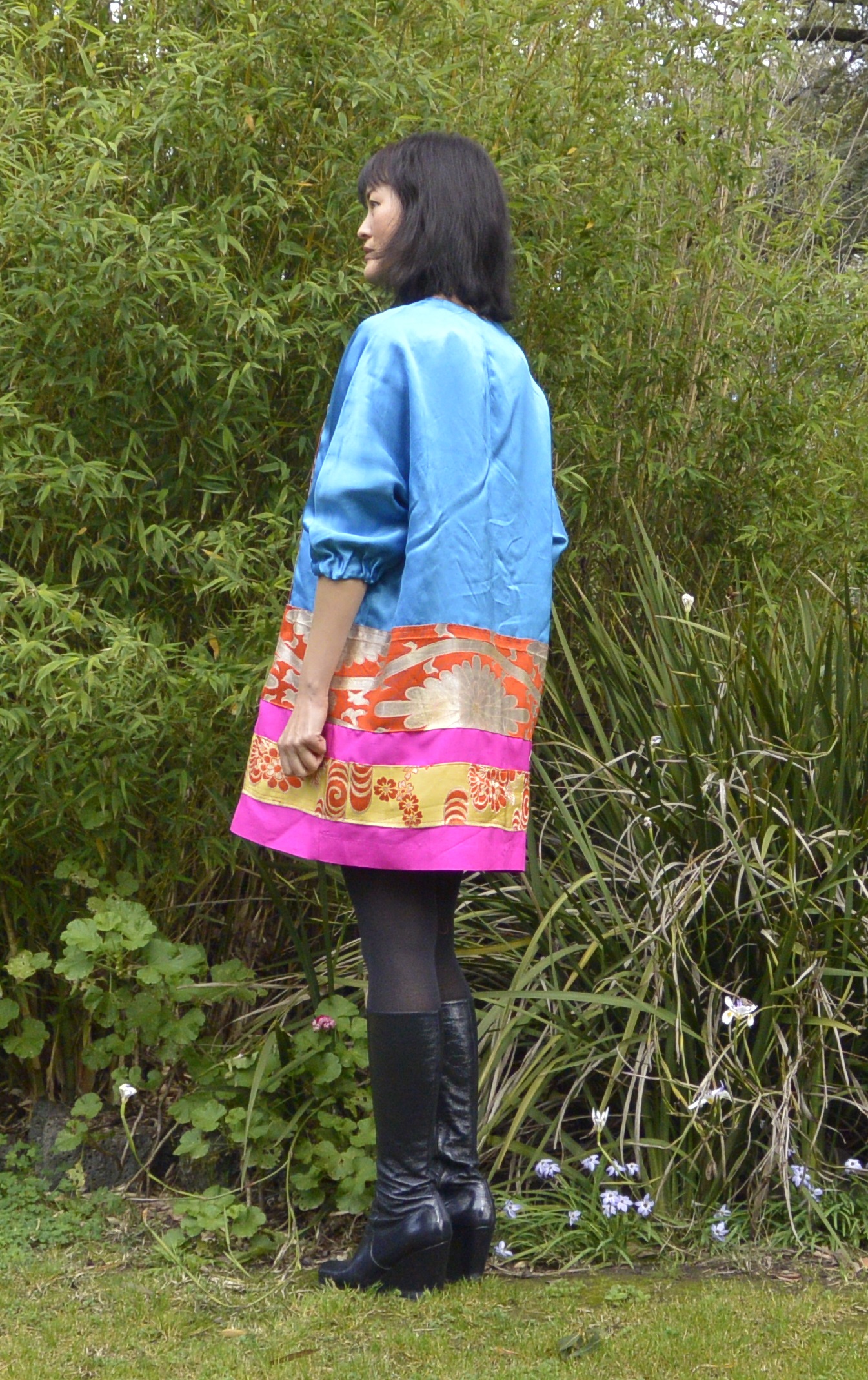 Having done that, I waited a year or so for inspiration to strike, dabbling with the idea of changing it back into a jacket with frogging down the front, or adding appliqued beach scenes, or making patterns on the sleeves and back with rouleau loops, or a million other ideas which all revolved around using up bits and pieces of my fabric stash, as does just about any DIY project I undertake. Finally I decided to make it into a mini dress and incorporate patches of kimono and obi fabric, first lengthening the tunic into a dress by attaching the hem section I’d chopped off this pink skirt (you can see the skirt here too).