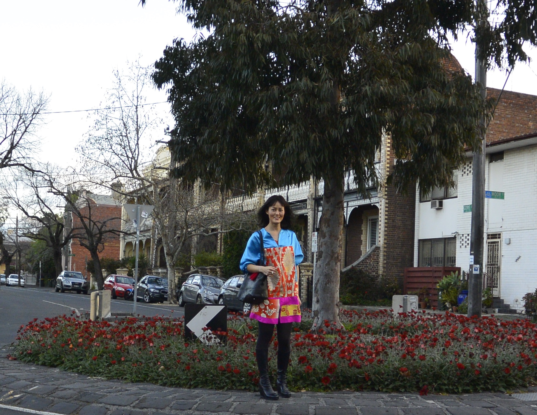 I wore the dress out to the last show at MSFW as I knew the show would be colourful and no one would look at me as if I were crazy for wearing something other than black, white or grey in Melbourne. Ideally, I would wear it with bare legs and chunky heels, but the weather wasn’t spring-y enough for that so I had to pull on some tights and boots. Then, because it had taken three years to make, I wore THE SAME OUTFIT (shh! don’t tell anyone!) to a fashion-y do on the weekend and got someone who is a lot better at taking photos than me to snap me in front of possibly the prettiest roundabout in Melbourne.