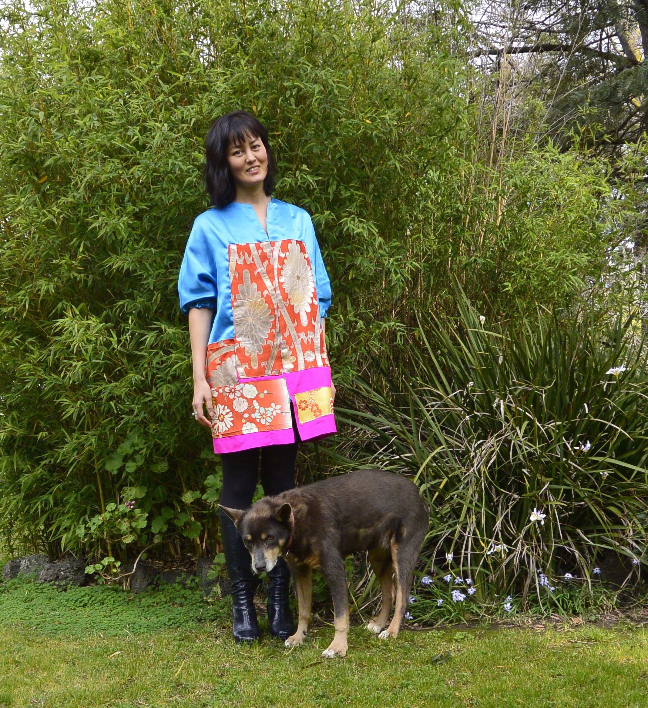The pink hem and the blue tunic fitted together perfectly and once I’d sewn them together the basic dress was ready to be decorated with kimono and obi scraps that have been patiently waiting to make an appearance for, oh, about 12 years. Here’s the dress from a few different angles, with the dog thrown in for good measure (note her attempt at “blue steel”. I think she’s pretty much nailed the moody model look. Also note, I am not in front of the grey brick wall because 1. mum happened to be around so I got her to take photos instead of having to fiddle with the tripod and 2. a certain reader has been complaining that they are sick of the brick wall. Is this better, Aunty Ann?)