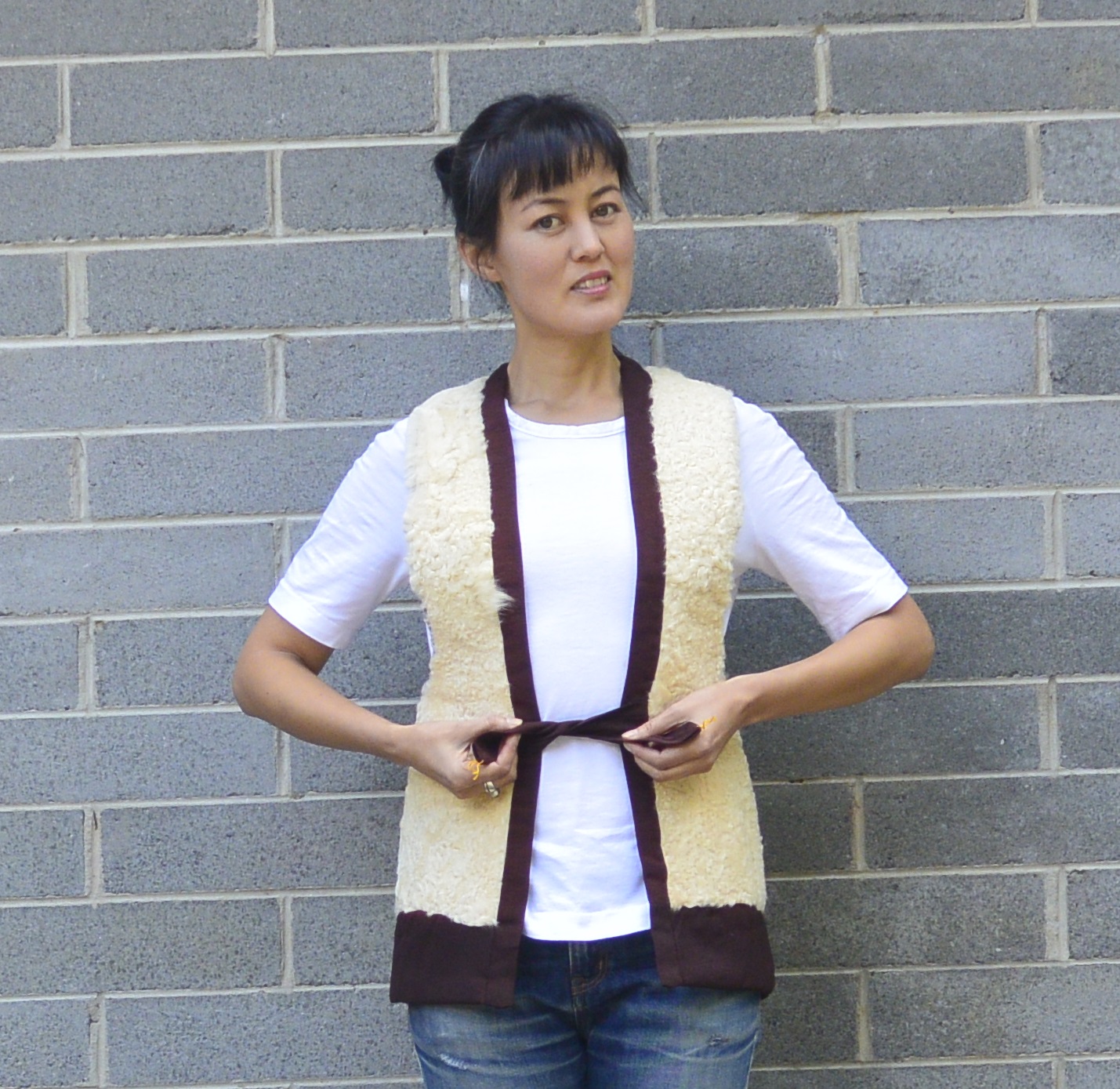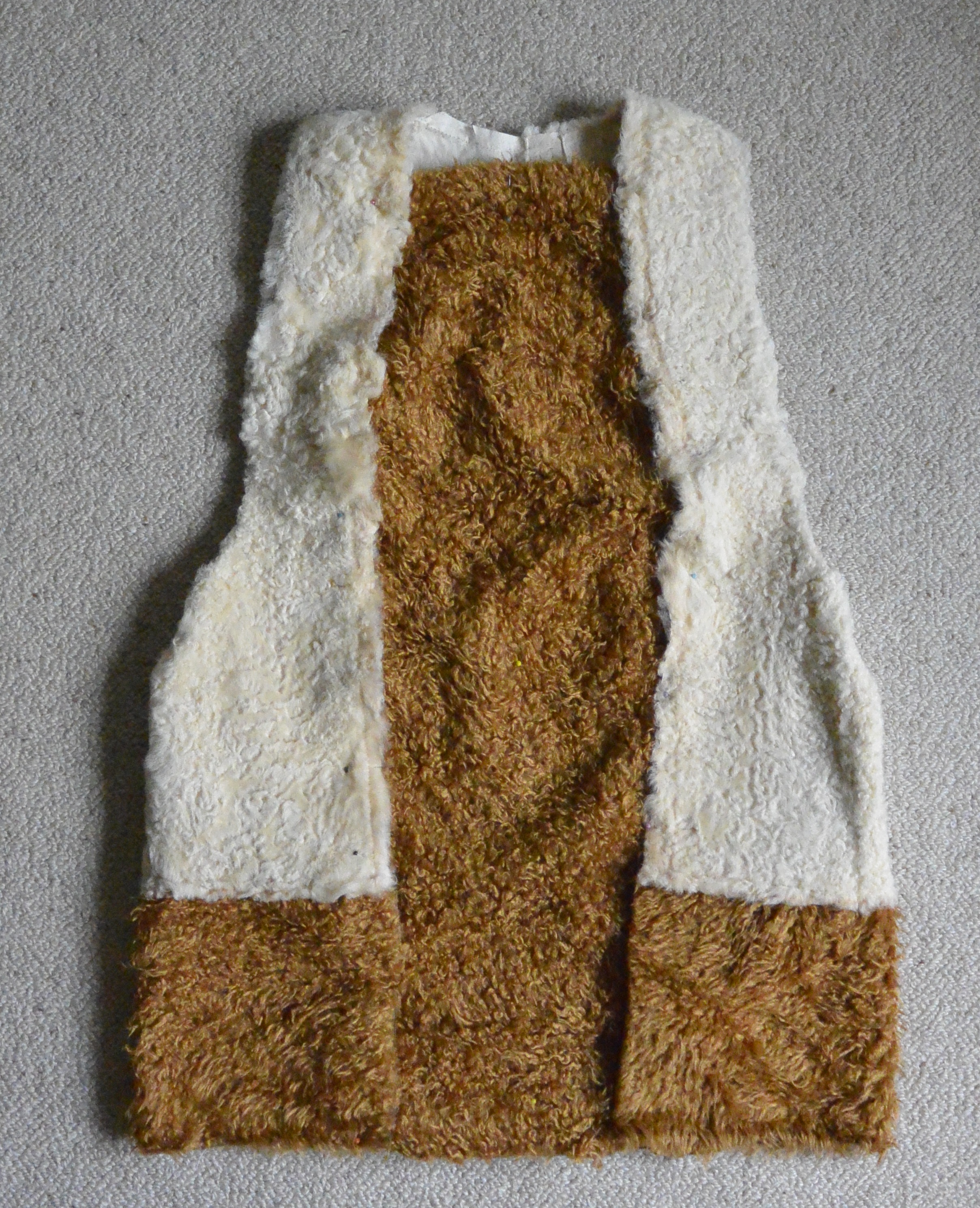 Typical of garments from flea markets in Japan, it was in pretty much immaculate condition despite being so cheap, although the fabric was perhaps a bit stained from wear. It seems to be a traditional garment, perhaps for a teenage boy? It’s similar to a vest I saw in a museum in Seoul, although I never saw anyone wearing one the entire time I was in Japan. As most traditional Asian garments are, it was pretty much unshaped – no darts, all straight lines, unfitted. Plus, the fronts didn’t meet and I didn’t like the colour of the fabric. So it was really the sheepskin that I wanted to salvage and rework. Having removed the fabric from the vest, I added a strip of fake fur (from my sister’s stash that she was using to make soft toys!) along the hem to create a longer garment and a wide rectangle between the front edges which I slashed down the middle (after I took this photo).