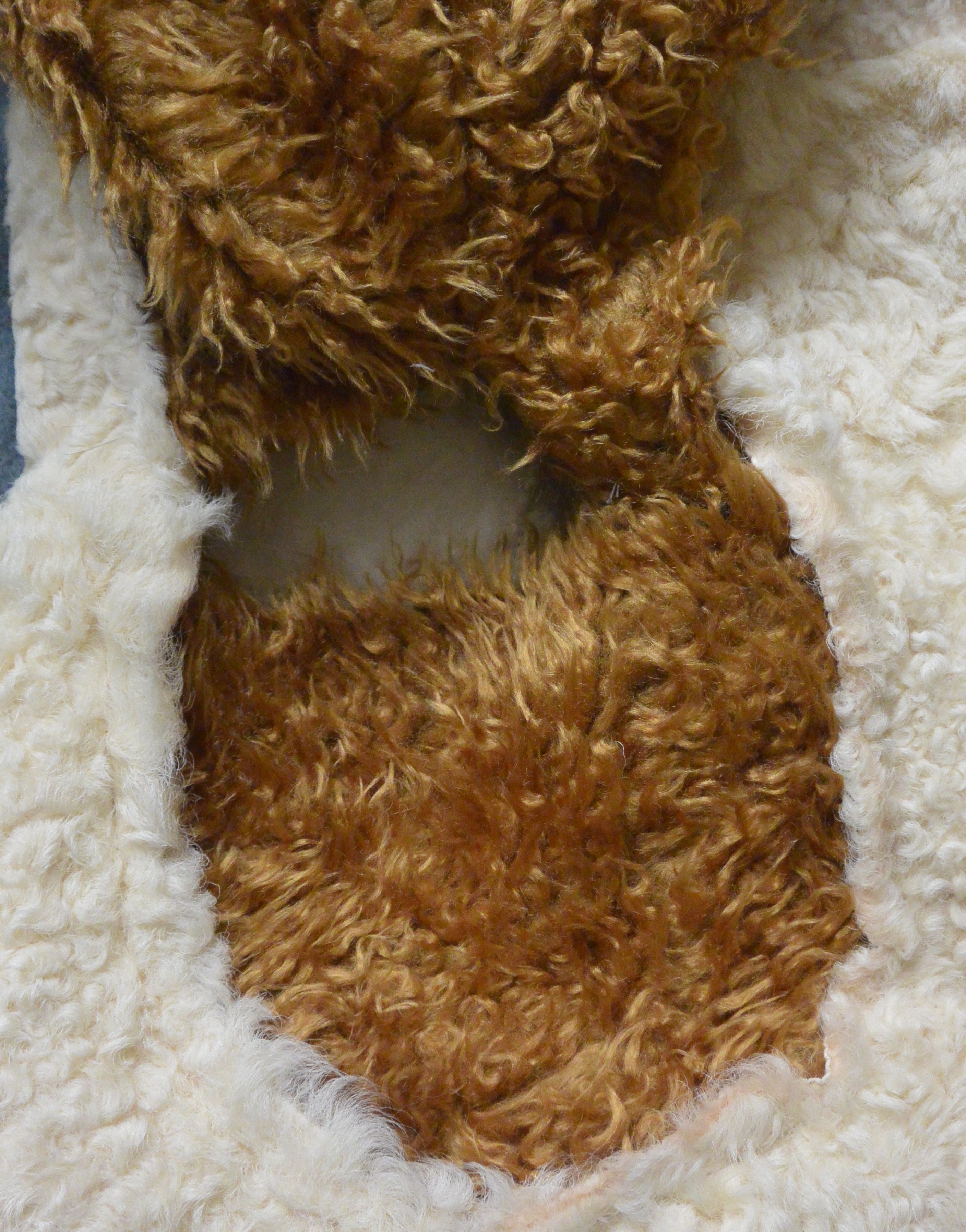 In my initial post about this project, I showed you how I added fake fur to the hem and down the front edges of the shearling vest. That wasn’t so hard, but the next step – retrofitting fake fur sleeves – was where I got stuck. The vest had deep armholes because (I assume) it was made to wear over a kimono, and kimono have very wide sleeves. The armholes had to be “filled in” if I wanted the sleeves of the resulting jacket to have a narrower fit, so I cut pieces of the fake fur and attached them to cover up the lower sections of the armholes.