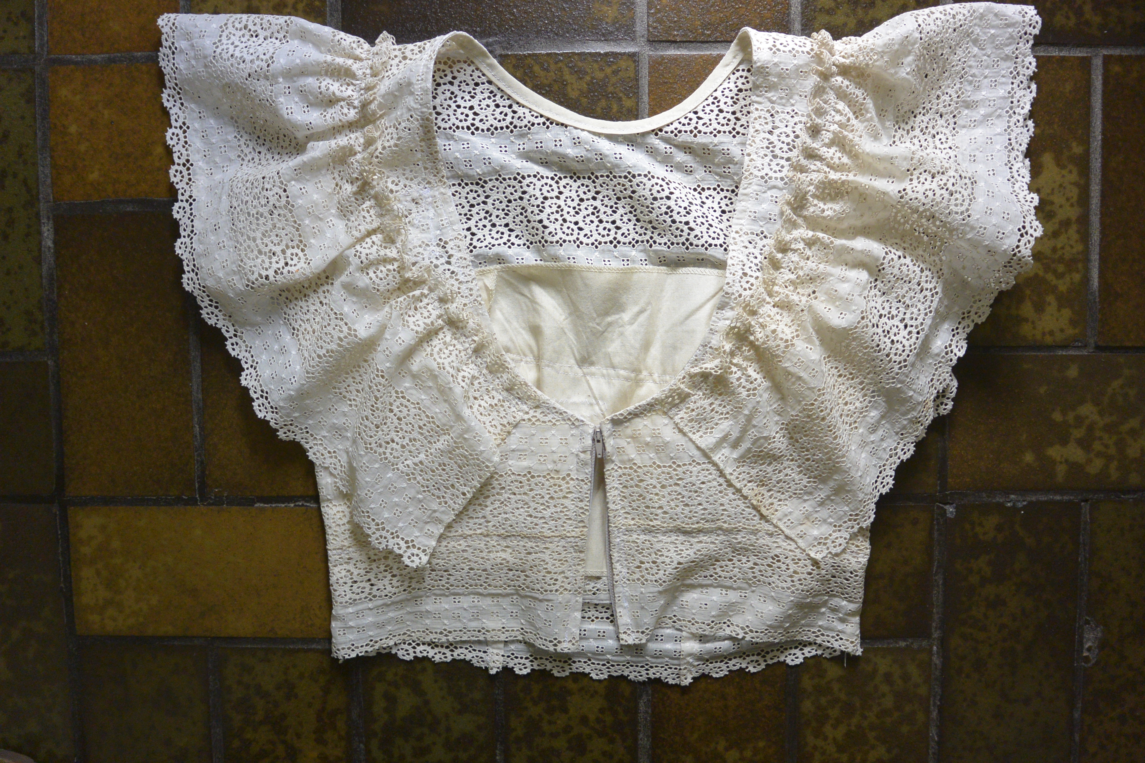 Anyhoo, what I actually did to remake the dress was to turn the bodice back to front. This meant that I could disguise the holes in the former back with a ruffle, and chop out the rust stains in the former front, creating a scooped back. I sewed in this calico bodice (which I made when testing a pattern years ago and kept because you never know when you will need a half-finished calico bodice) to make it a bit sturdier and also because lace is see-through and no one wants to see my underthings!