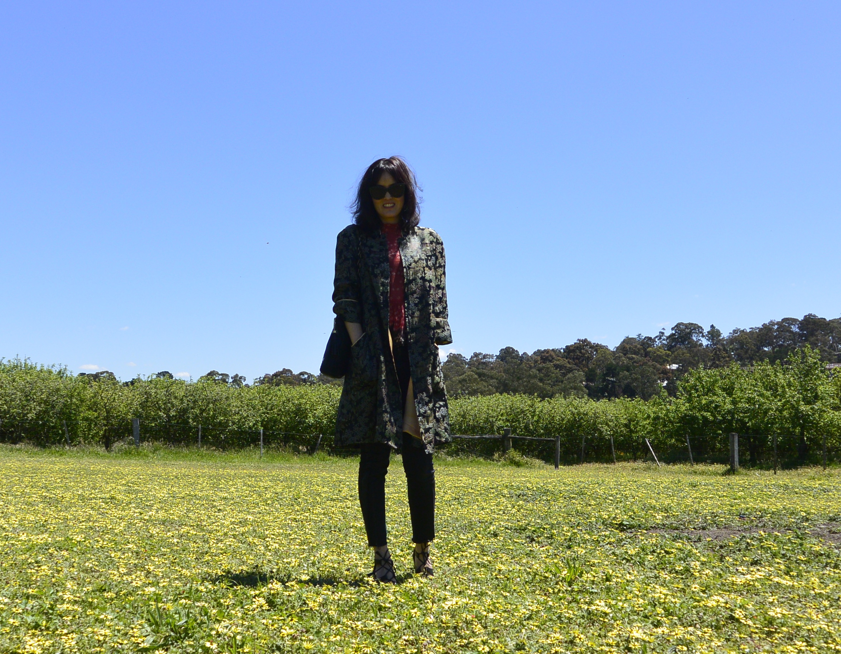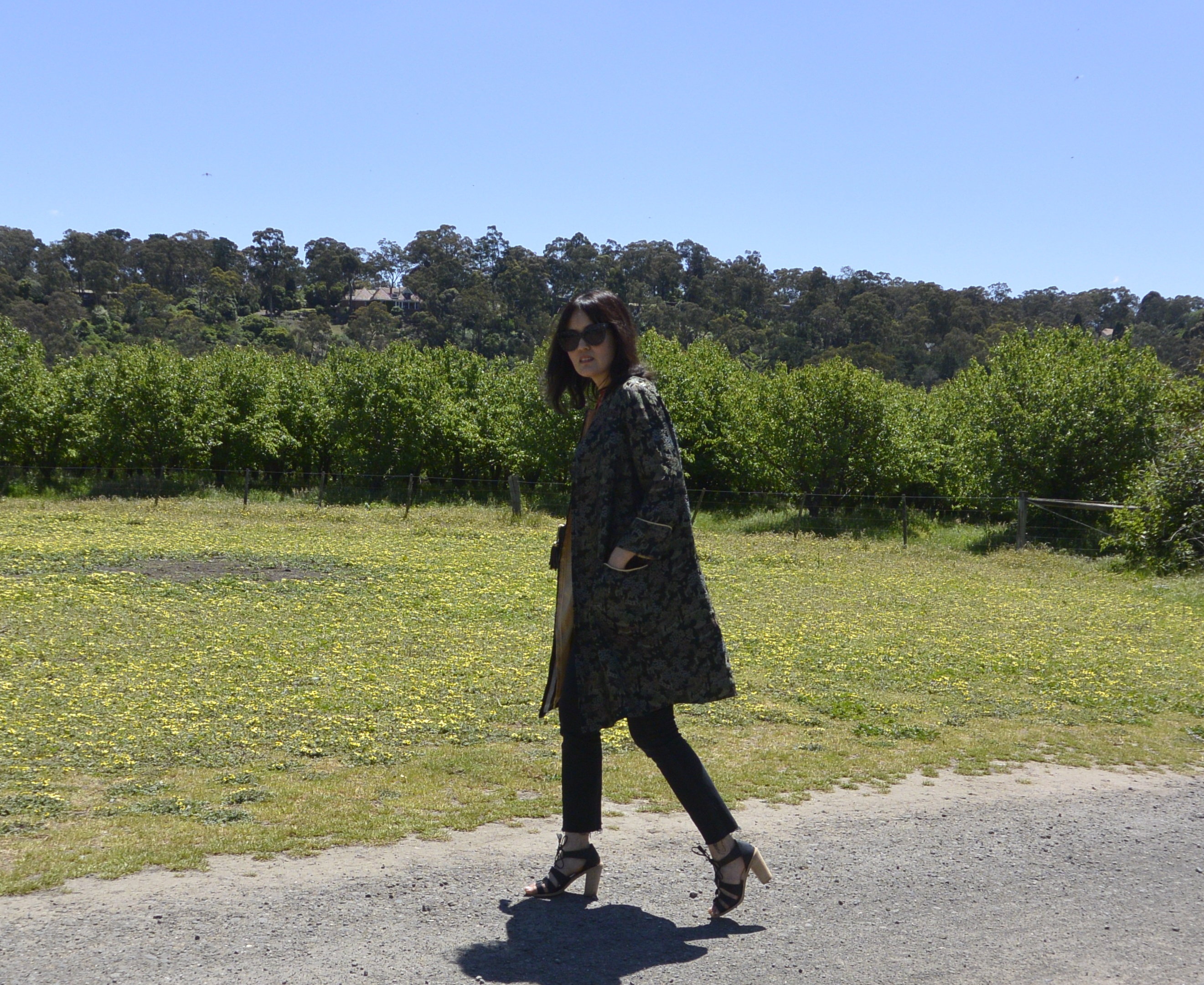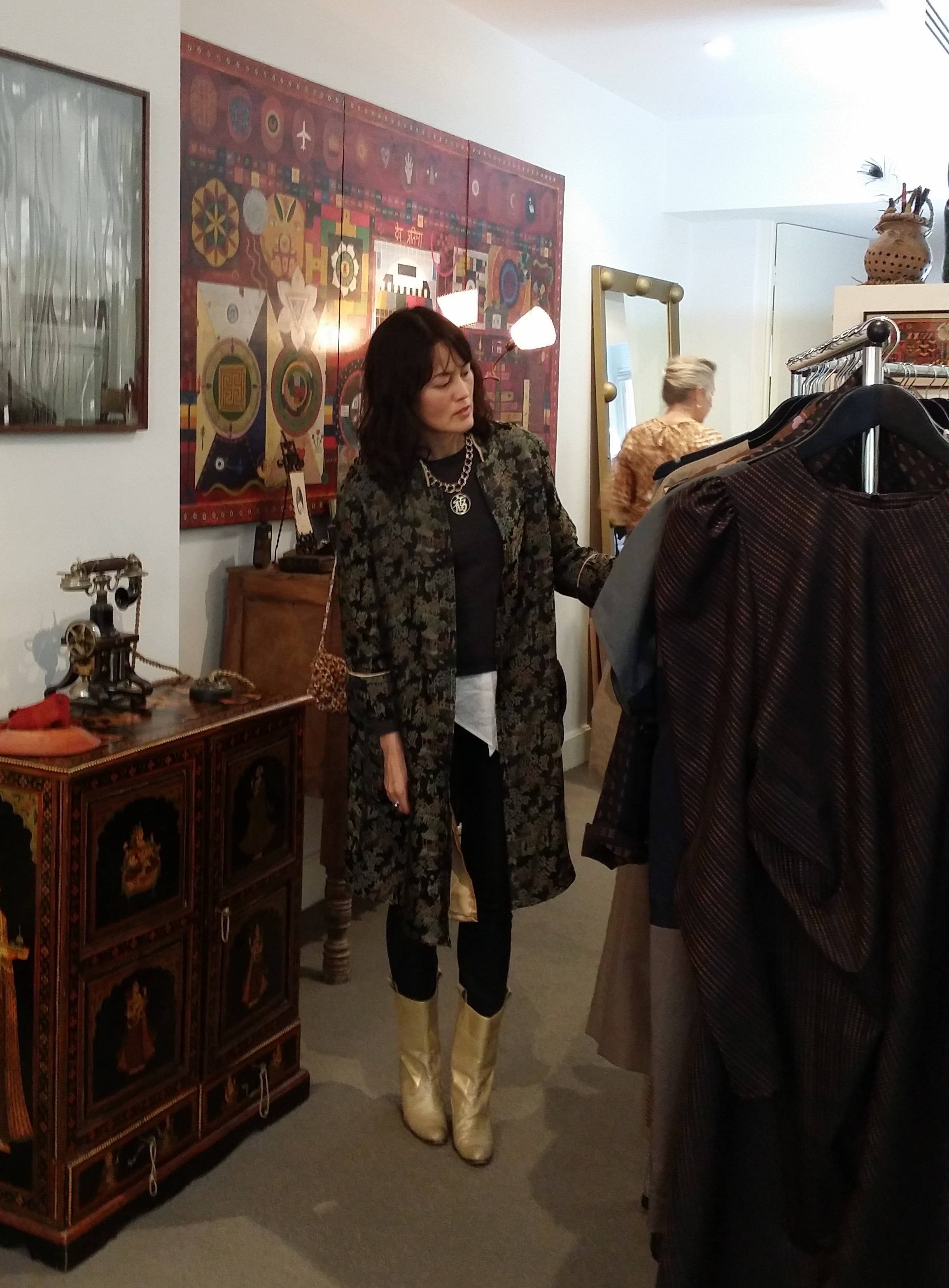 And again as a jacket to check out Kara Baker‘s spring summer range in her salon (which just happens to look exactly the way I want my house to look when I grow up. You can see a bit more of it here.). In this pic you can see Kara in the background and also you can see how I left the jacket lining hanging loose – and how it just happens to match exactly with my gold boots!
