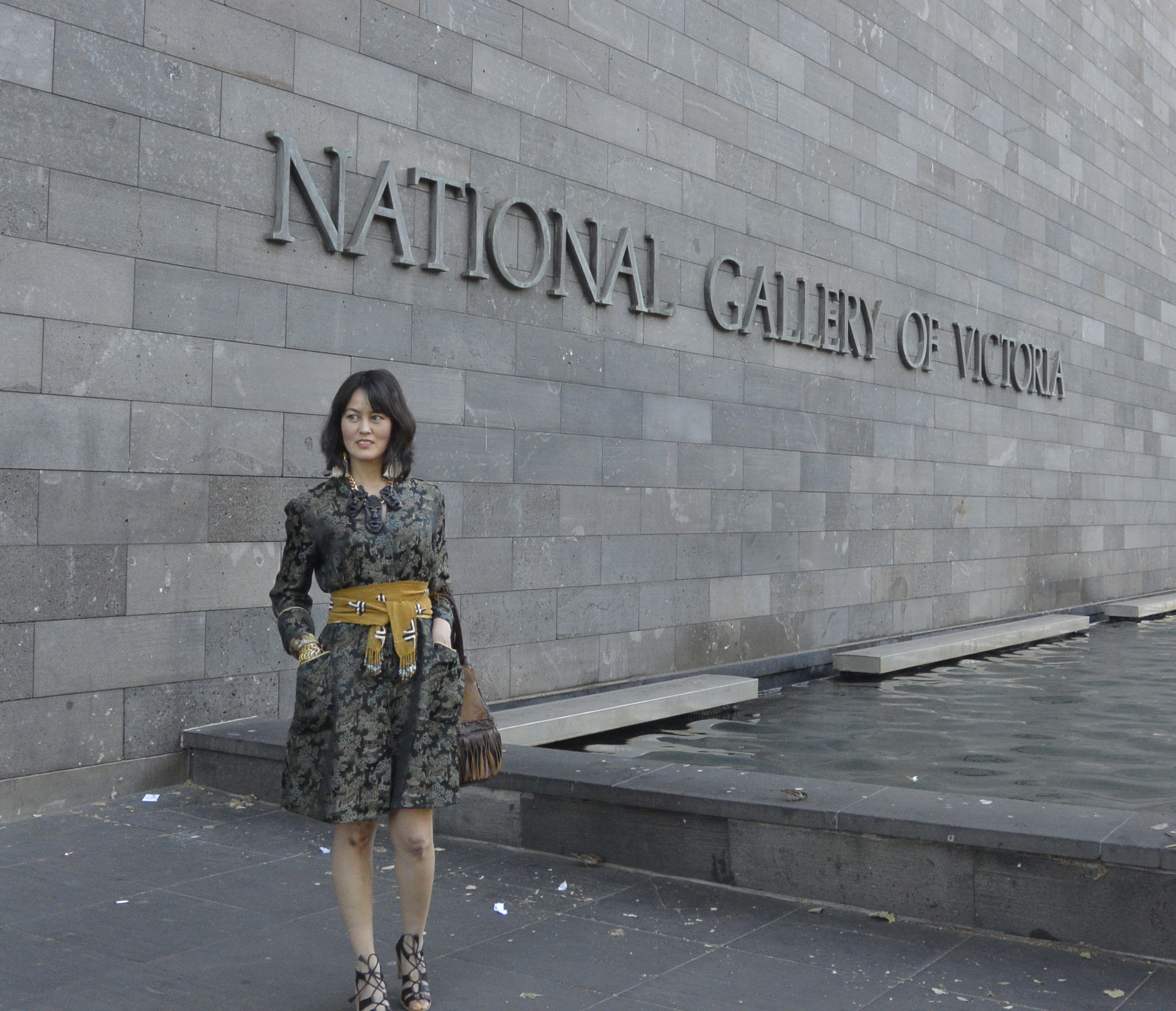 I’ve worn it several times so far, as a dress (fastened very professionally up the inside front with safety pins and “belted” with a mud print scarf) to the opening of the NGV’s new Contemporary Jewellery Space (it’s inside the gallery shop and anyone can shop there. Christmas is coming up. You’re smart people, I’m sure you can put two and two together).