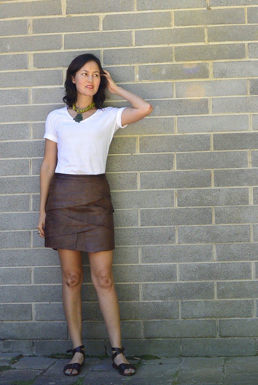 Yes, the old “make it into a mini skirt” trick, which was slightly more complicated than it usually would be for a leather skirt because of the overlapping panels at the front. The back was easy to shorten in that I just cut across it, but I had to unpick the panels at the front and then did a very shoddy job of finishing off the hemline, part of which involved turning excess leather under and making massively messy stitches (those messy vertical stitches on the left are from my initial makeover when I took the seams in).