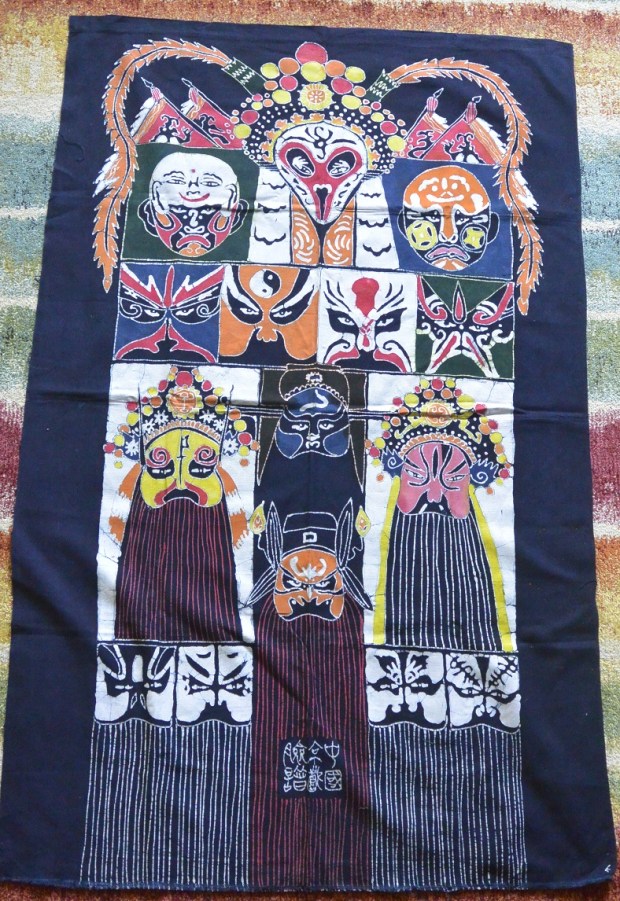 Where the Hmong batik is from (in this case, Laos) it gets much hotter and stickier, so this material should actually be perfect for summer as well as winter. The batik is all done by hand, freestyle – the artisans use wax to draw these stylised patterns of rice grains, elephant feet, flower seeds and so on from memory*. The fabric is then dyed repeatedly in indigo and the wax rinsed off to leave the white pattern underneath. I’m not sure if it’s the Hmong fabric or the Chinese opera wallhanging, but after making this (and even just after wearing it) my fingernails were quite blue. Definitely a garment to wash separately, by hand. Now there’s something else to do when I need to procrastinate!