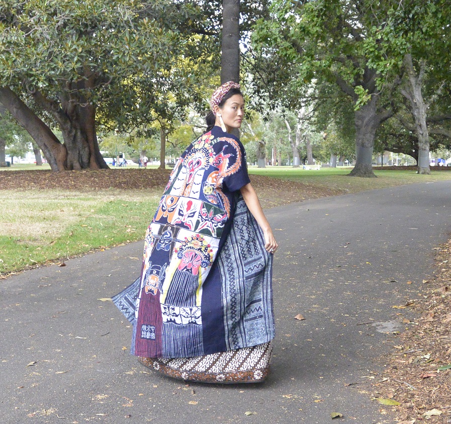 Part of my reason for making the opera coat (apart from procrastination) was so that I can wear batik in winter too, because with a jumper and tights underneath, it can be belted all the way around like a dress. Of course, as soon as I made it, the weather was freakishly warm, and my friends and I were melting as we picnicked in the Carlton Gardens, where I got them to take these photos.