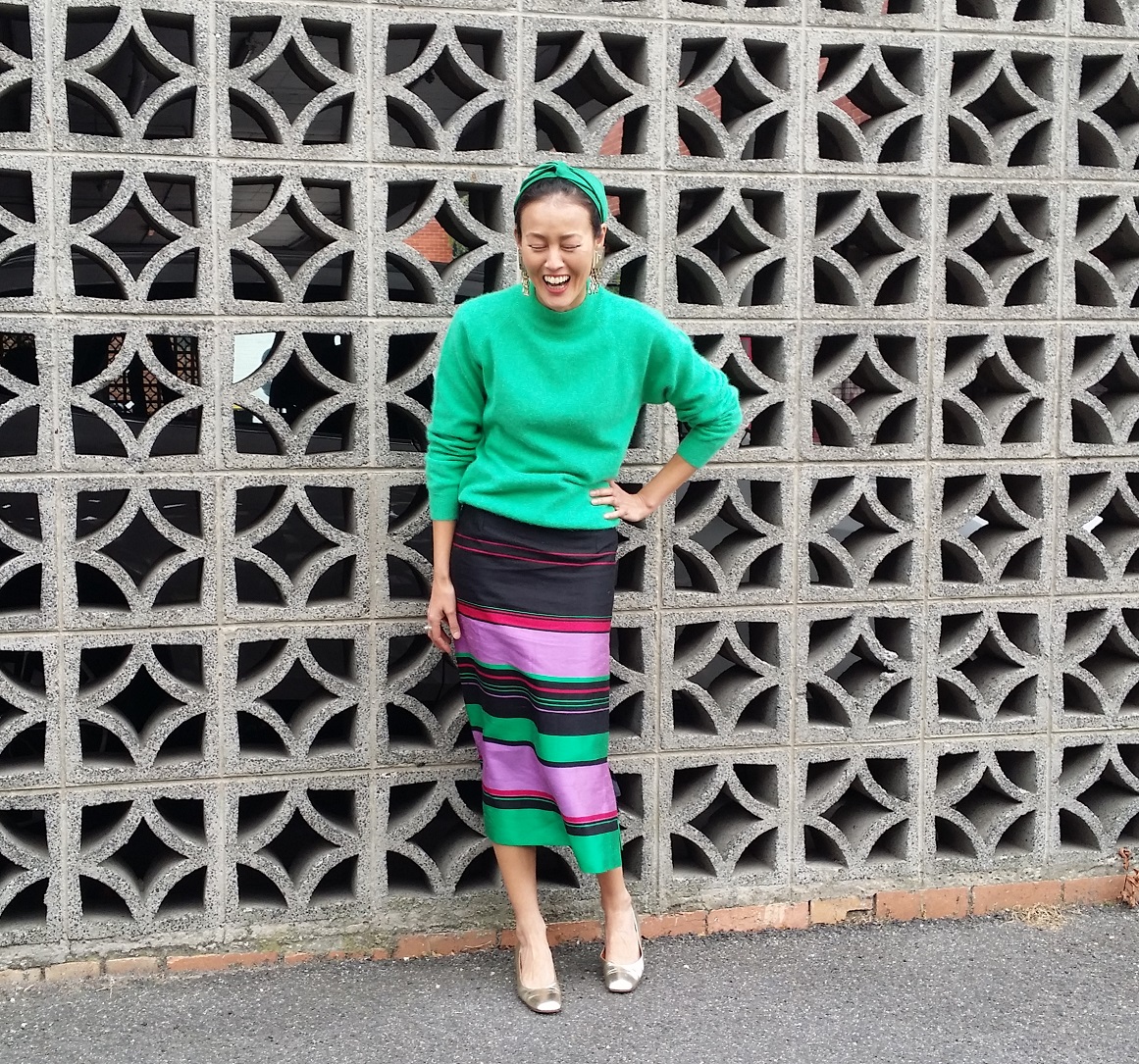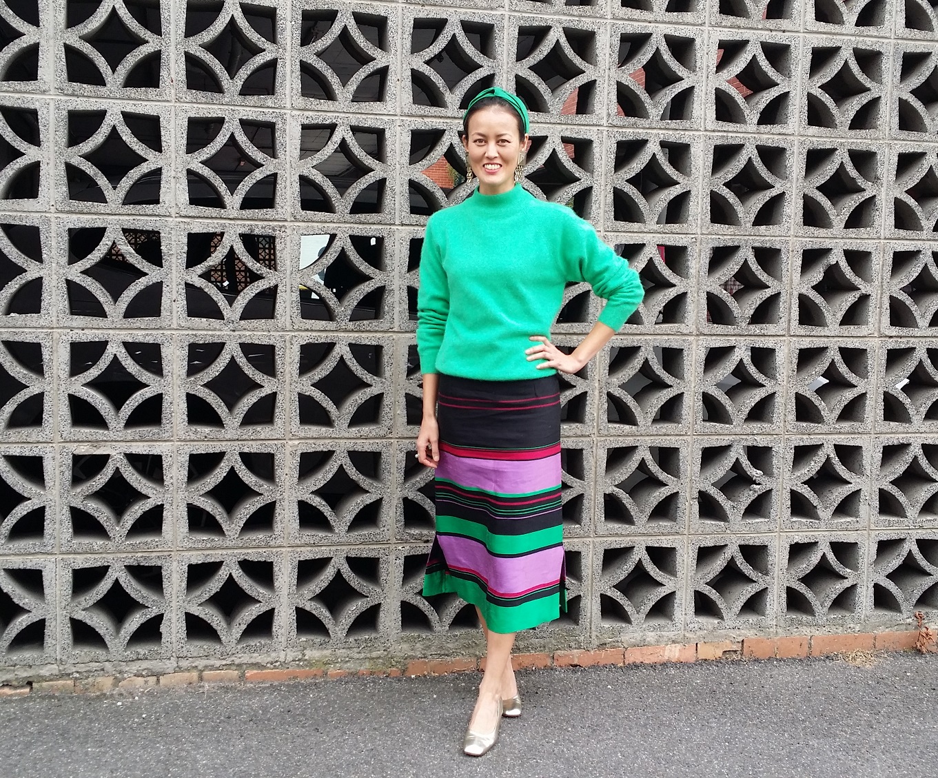 The green in the skirt is one of my favourite colours and happily, I found a cashmere sweater in a similar shade for $5 at an opshop a few months ago. Perfect match!