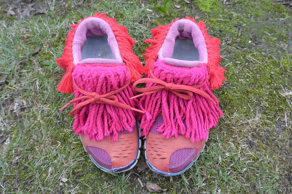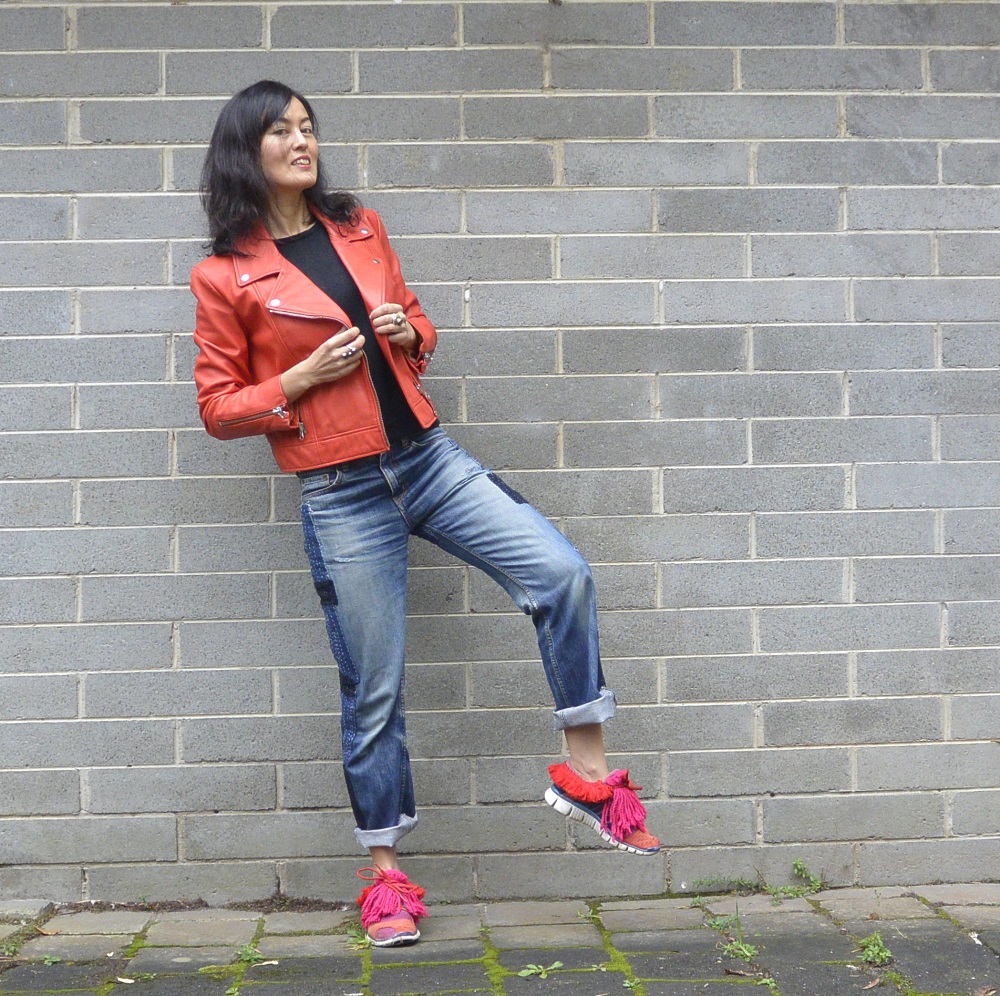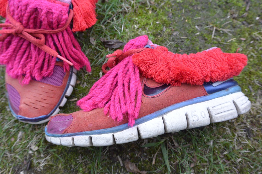 The red fringing was something I bought off the roll simply because I can’t resist fringing – I didn’t have a project in mind when I bought it. And now it has come in handy as a trim around the ankles of these sneakers, stitched roughly in place as I did for the pink tongue fringing.