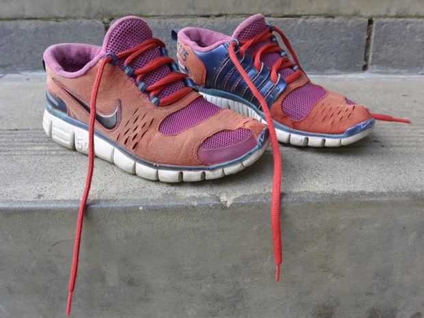 I know, I’m a sucker for anything with a tassel! And I’m also a sucker for taking inspiration from designer gear to refashion tired wardrobe items with bits and pieces from my haberdashery stash (haberstashery?). The tired items, in this case, are these sneakers (I can’t actually say they were ever really part of my wardrobe because they have been sitting outside for years and have faded badly; I was only ever wearing them when I needed to slip something on quickly to go to the local shops).