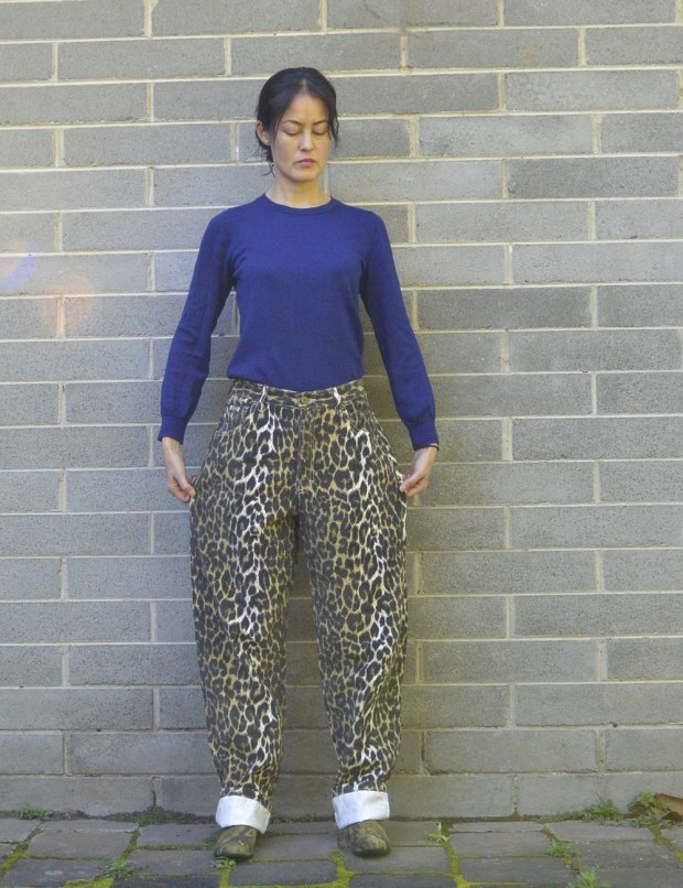 As much as I love fiddling with garments to make them fit me and my fashion needs, sometimes a quick fix is all I can be bothered with. So I didn’t overthink things when I found these big-cat print pants at an opshop recently (as they are Jag brand, maybe they should be called jaguar jeans? Fittingly, the opshop was an Animal Aid one!).