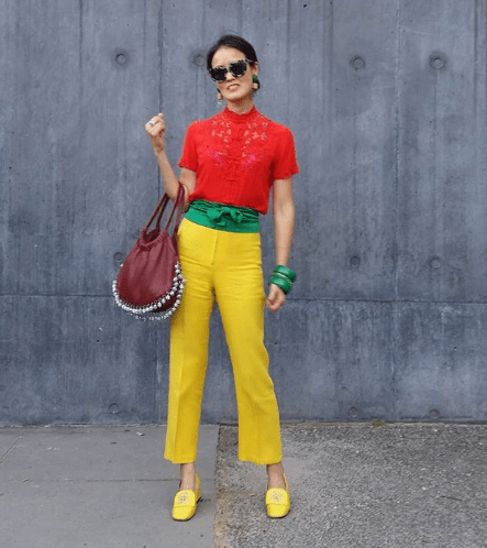 (Warning: sources claim that nearly all items in the following two images were purchased secondhand. Further, although the outfits appear to be completely different, the pants in both images are in fact the same pair.)